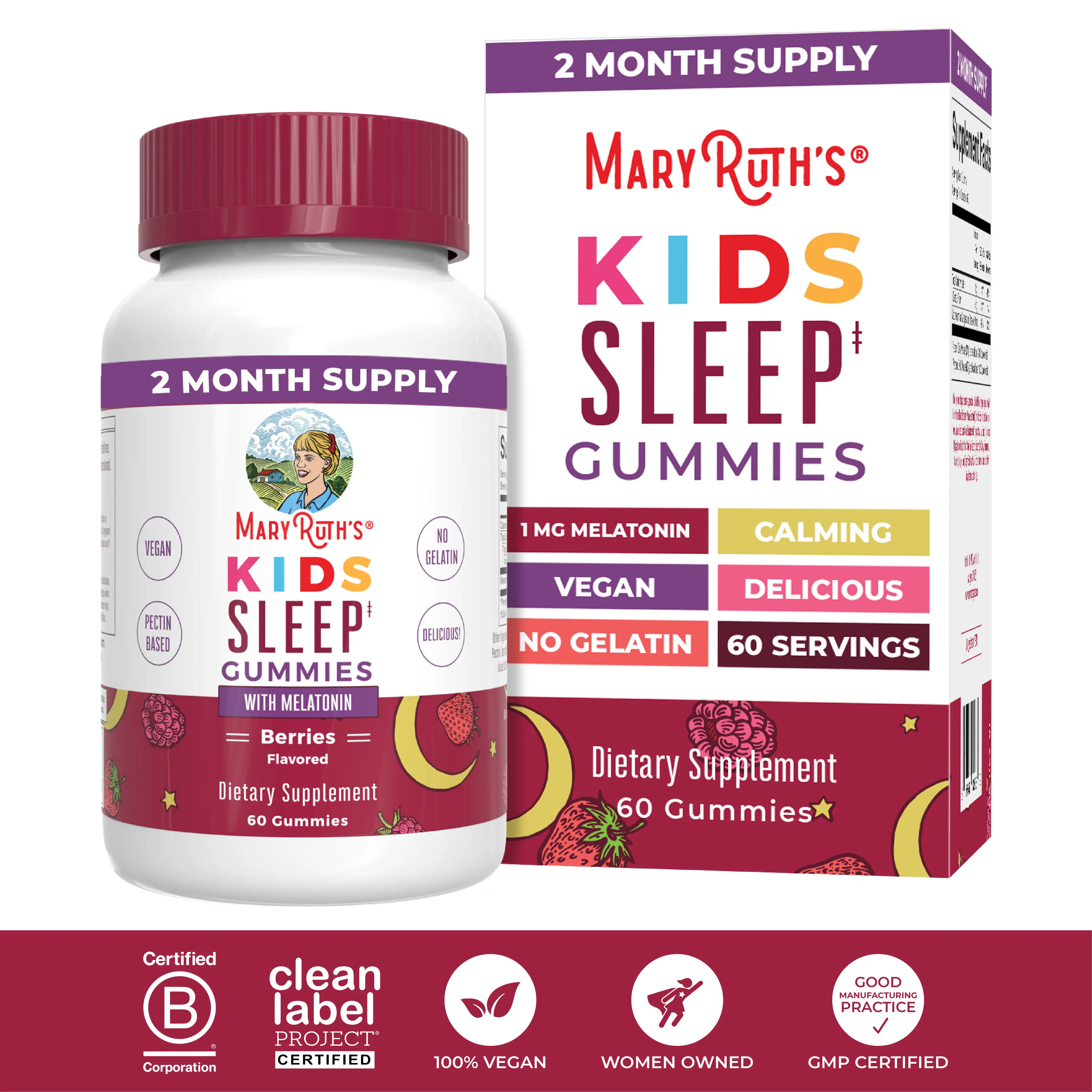 For Most Lifestyles: MaryRuth's Sleep Gummies for Kids are Non-GMO, No Gelatin, Pectin Based, Vegan, Made in a GMP (Good Manufacturing Practice) Facility. Dairy Free, Nut Free, Gluten Free, Soy Free. Clean Label Projet Certified. B Corp Certified.