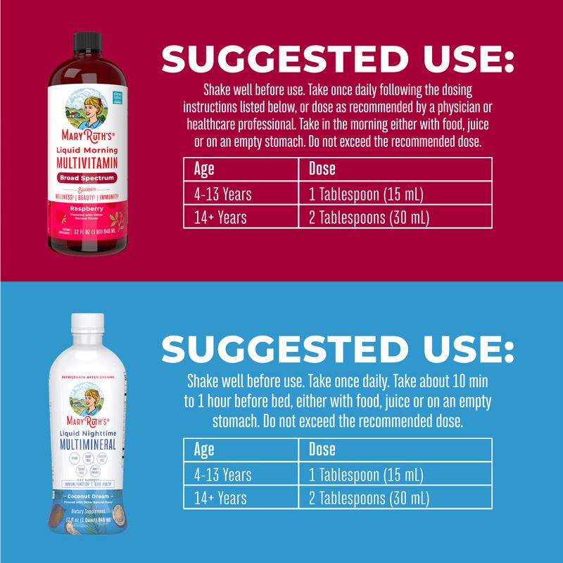 Liquid Daily Multivitamin: Support your body’s nutrient needs, all with no hard-to-swallow pills. MaryRuth’s delicious Raspberry Liquid Morning Multivitamin is an easy-to-take liquid with minerals, amino acids, and multiple essential vitamins including antioxidant vitamin C, vitamin D, vitamin E, and beta carotene.