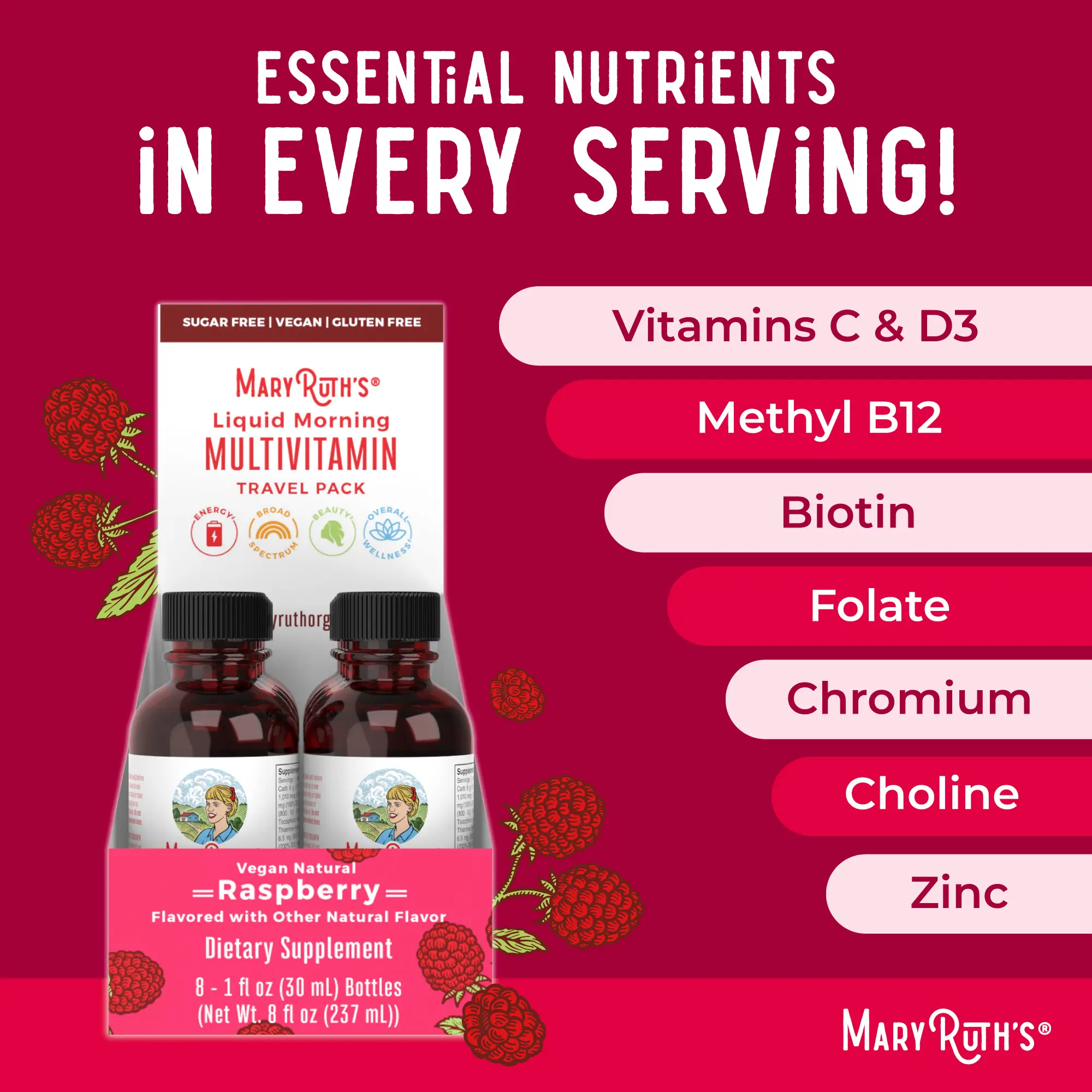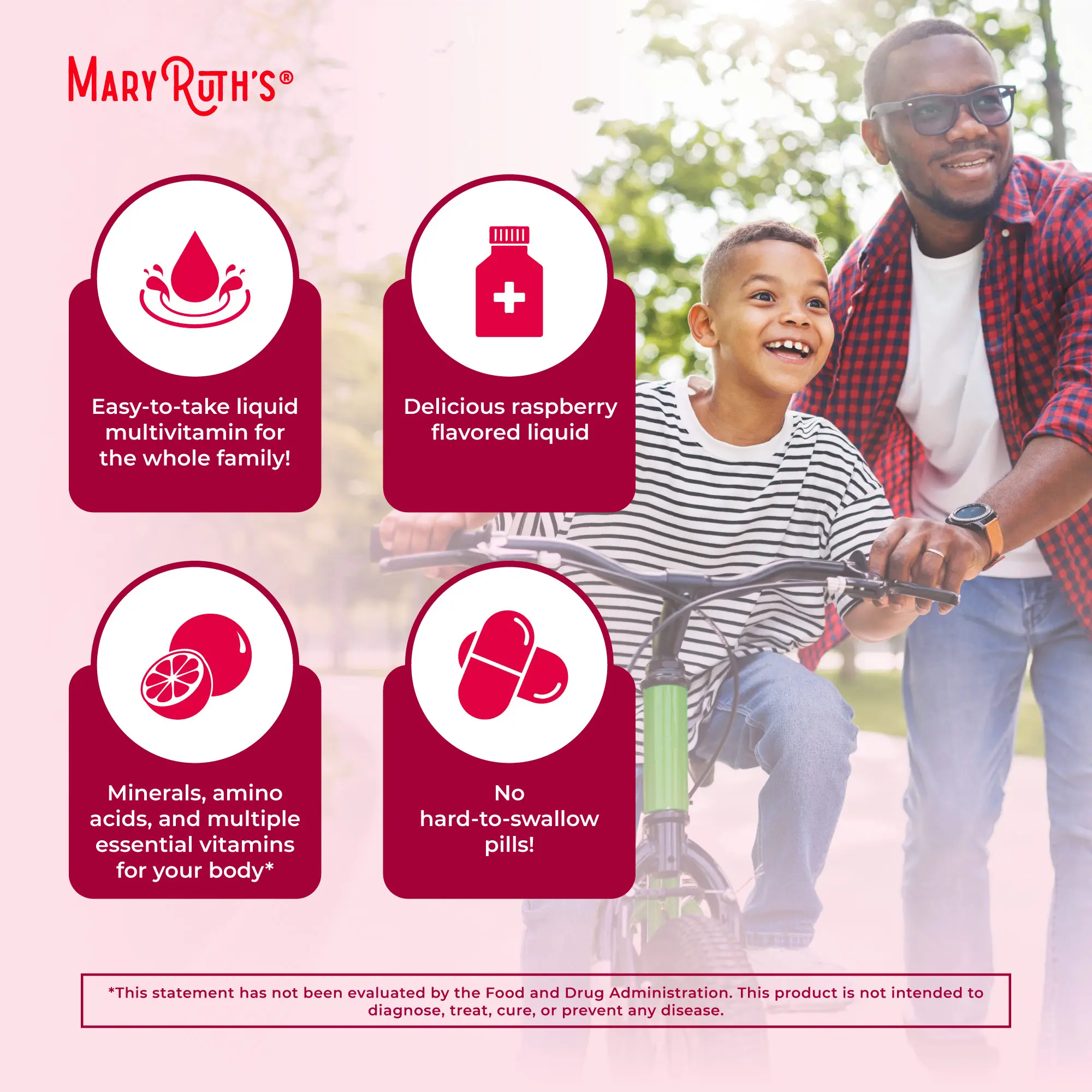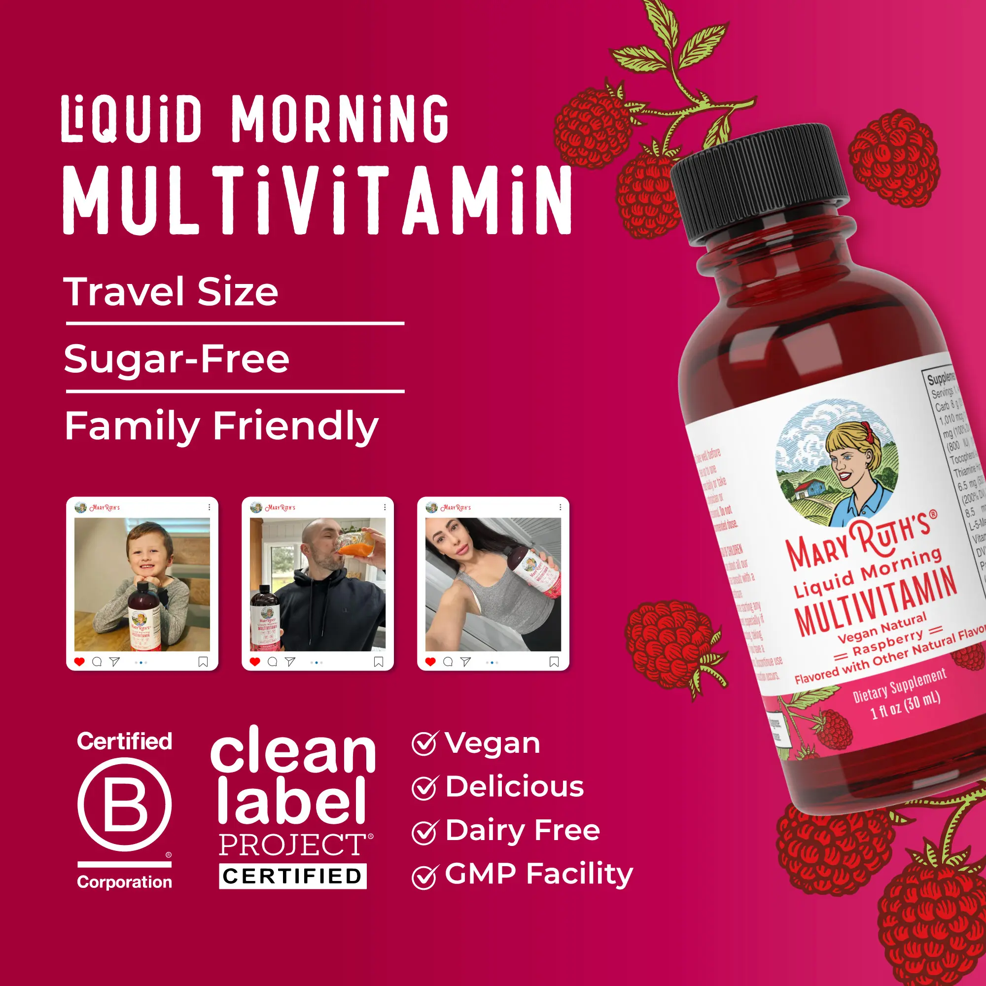 Liquid Daily Multivitamin: Support your body’s nutrient needs, all with no hard-to-swallow pills. MaryRuth’s delicious Raspberry Liquid Morning Multivitamin is an easy-to-take liquid with minerals, amino acids, and multiple essential vitamins including antioxidant vitamin C, vitamin D, vitamin E, and beta carotene.