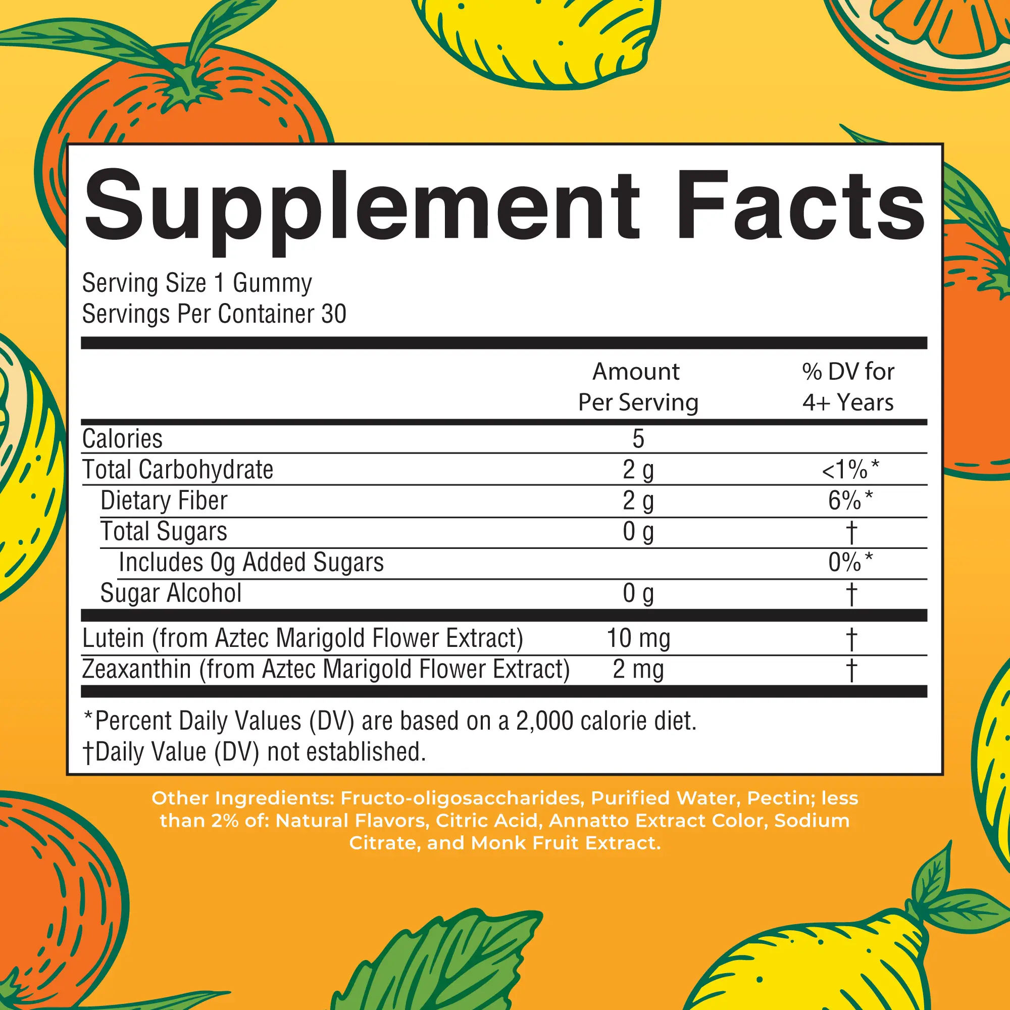 Eye Health: These tasty gummies are formulated with lutein and zeaxanthin from Aztec Marigold Flower Extract and help support eye health by increasing macular pigment in the eye.