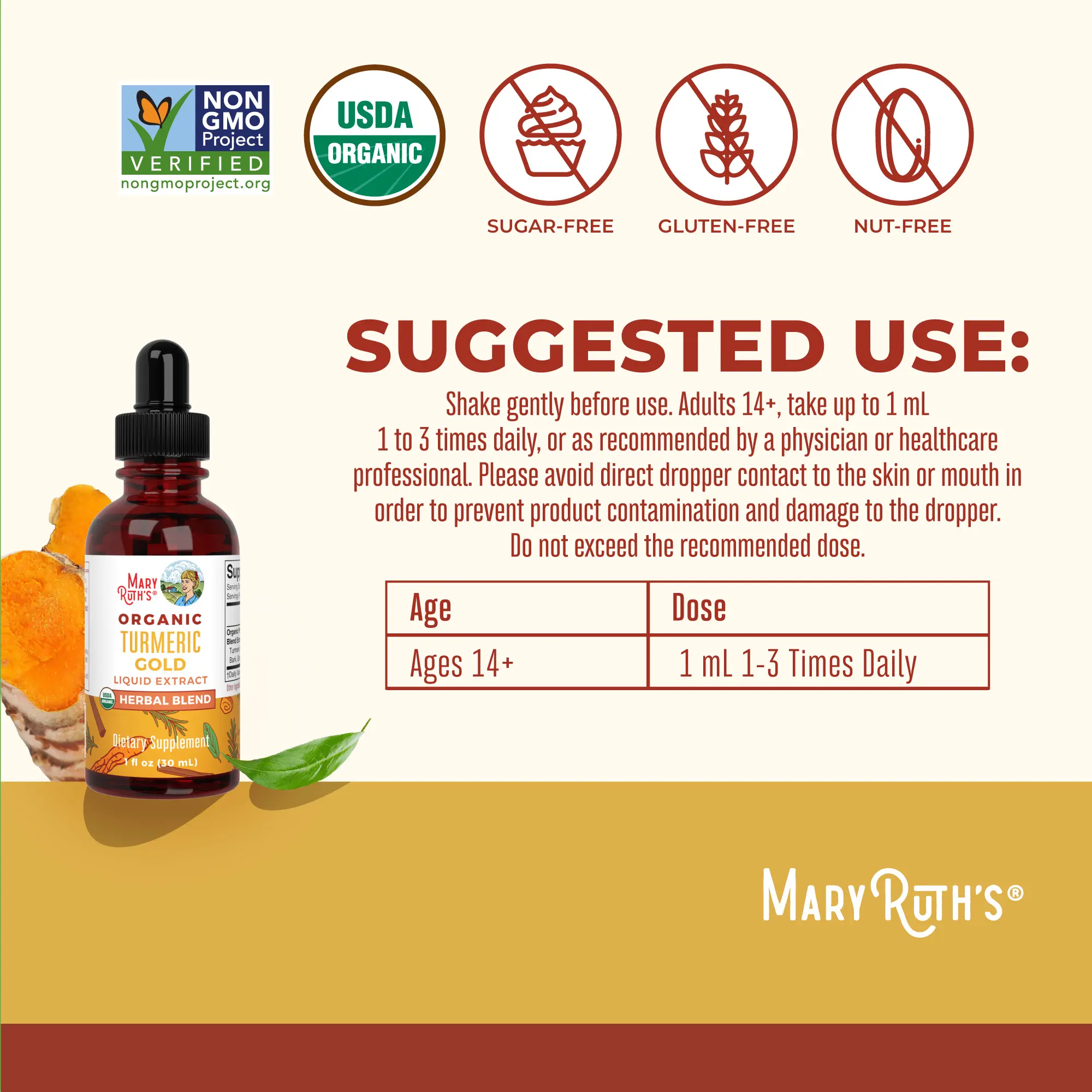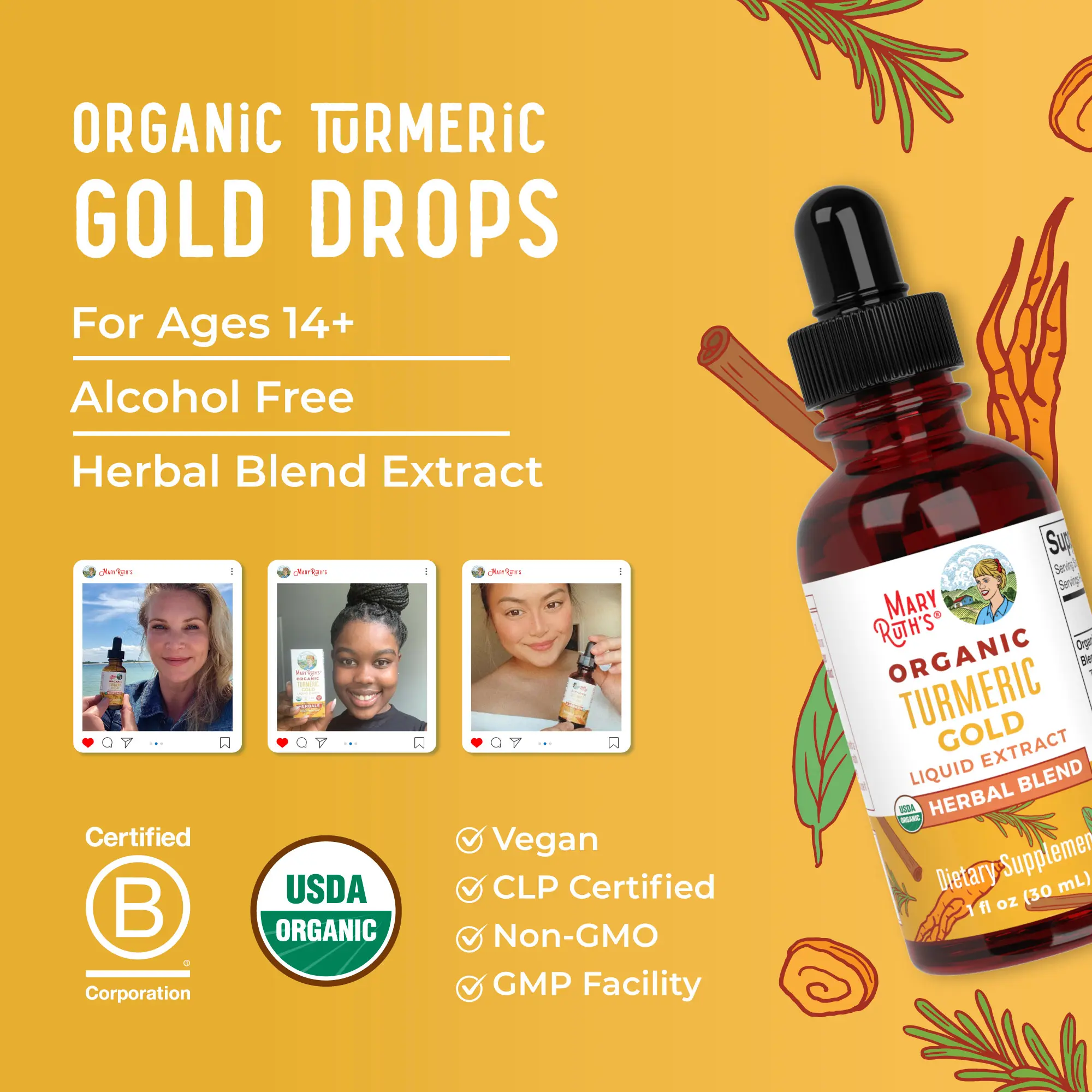 For Most Lifestyles: MaryRuth's Turmeric Gold Herbal Blend Drops are USDA Organic, Non-GMO Project Verified, Vegan, Made in a GMP Facility. No Synthetic or Artificial Colors, Dairy Free, Nut Free, Gluten Free, Soy Free, Sugar Free, Alcohol Free Tincture. Clean Label Project Certified. B Corp Certified.