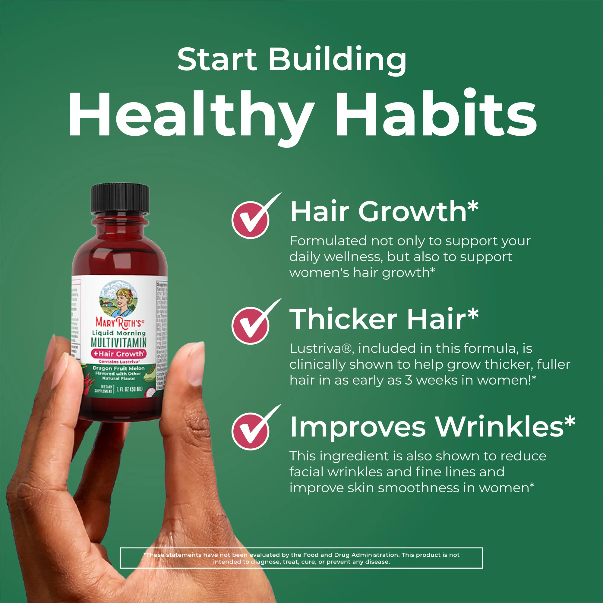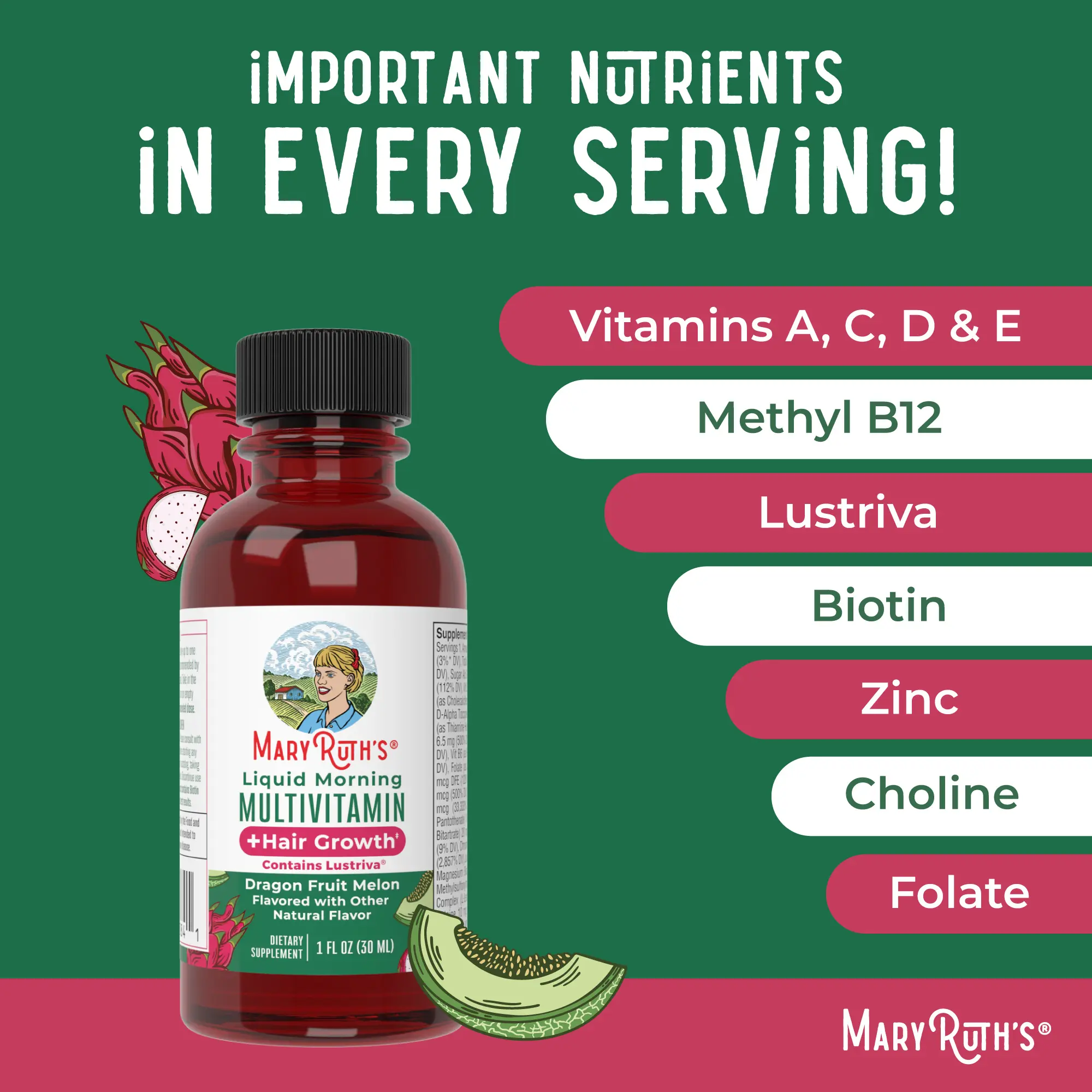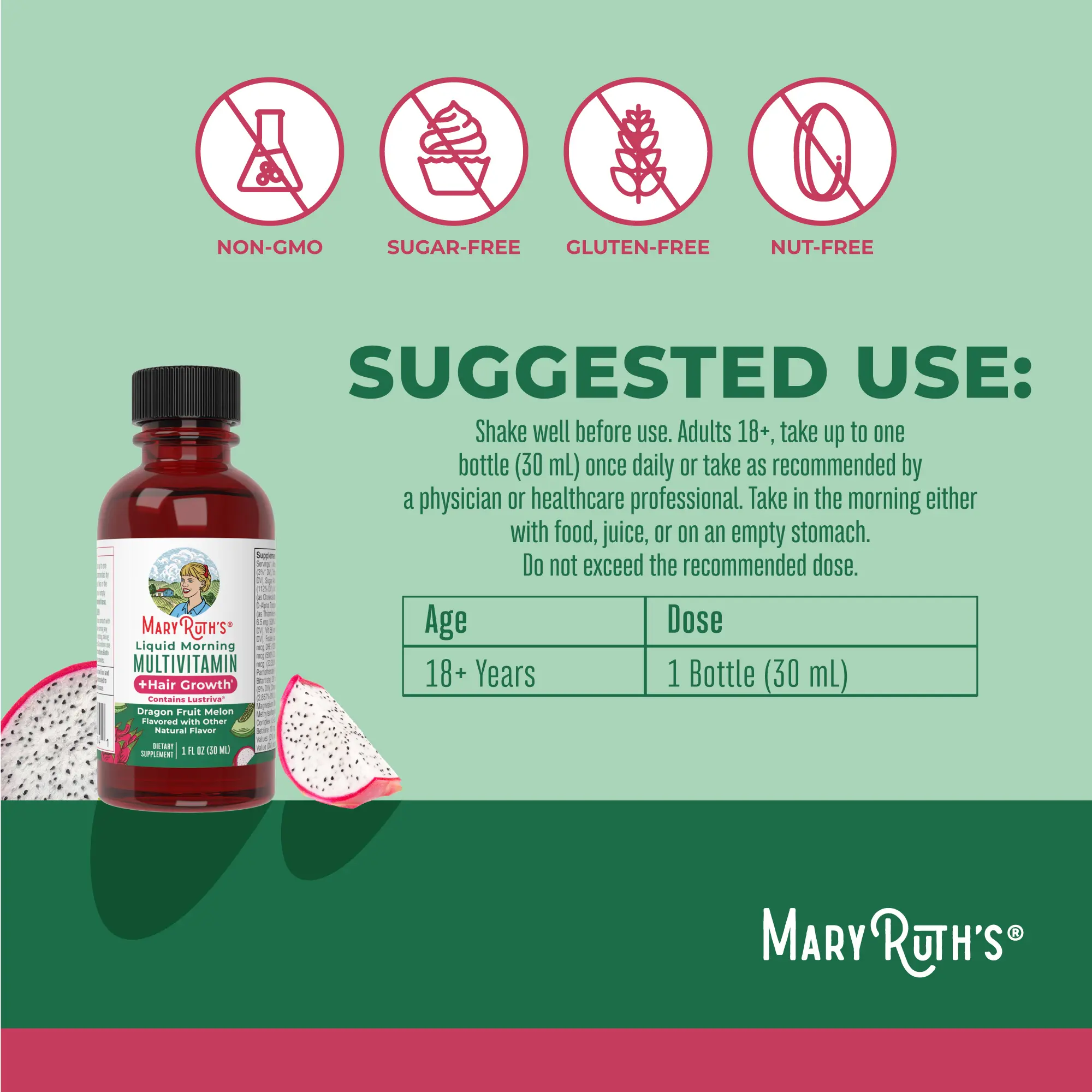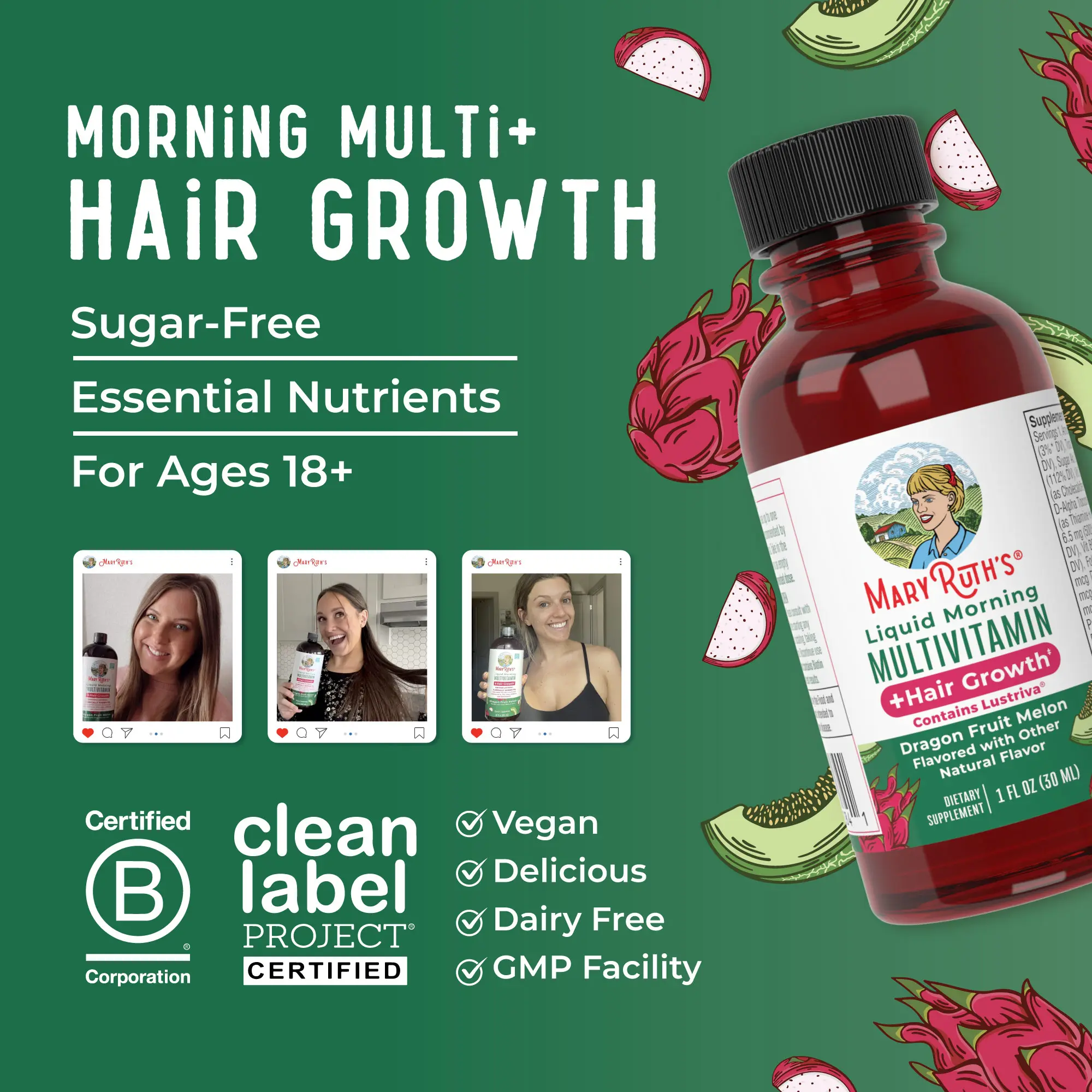 For Most Lifestyles: MaryRuth's Travel Size Liquid Morning Multivitamin + Hair Growth is Vegan, Dairy Free, Gluten Free, Nut Free, Sugar-Free, and Made in a GMP Facility. Third Party Tested. Clean Label Project Certified. B Corp Certified. Women Owned Business.