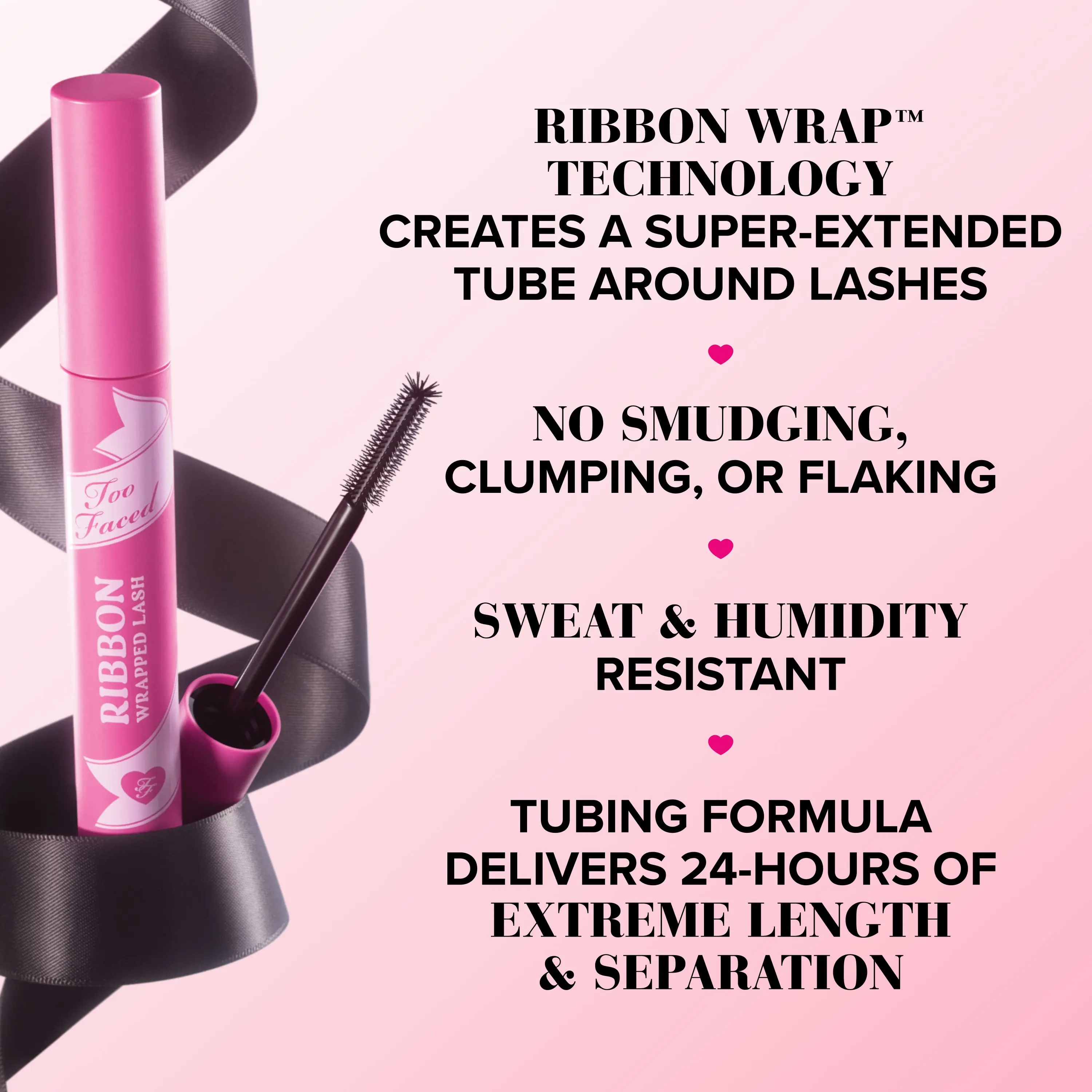 Our transformative Ribbon Wrap™ Technology creates a super-extended tube around lashes, stretching them to unbelievable lengths while our Lash Extension™ Brush sweeps through all lash types, including fine, sparse, short, straight, curly, downward, and dense lashes, wrapping them in our deep black formula and elongating them to outstretched perfection.