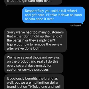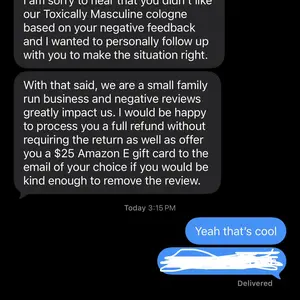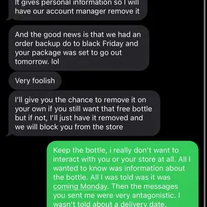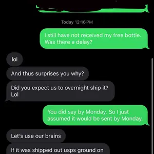 They asked to leave a good review for a free bottle. I did enjoy the cologne so I did leave a good review however. After noticing the delay I just wanted an update. And this is how they reply? I understand my question was stupid but I simply just wanted an update since it was already two days late.