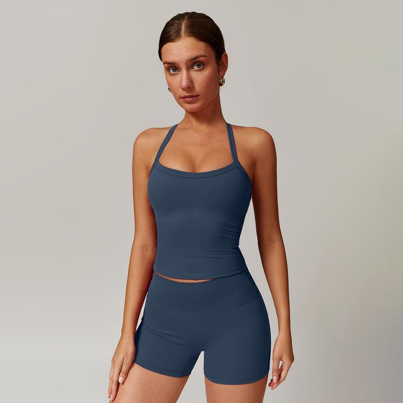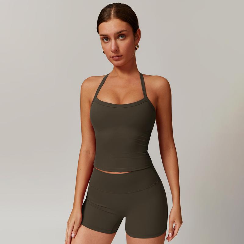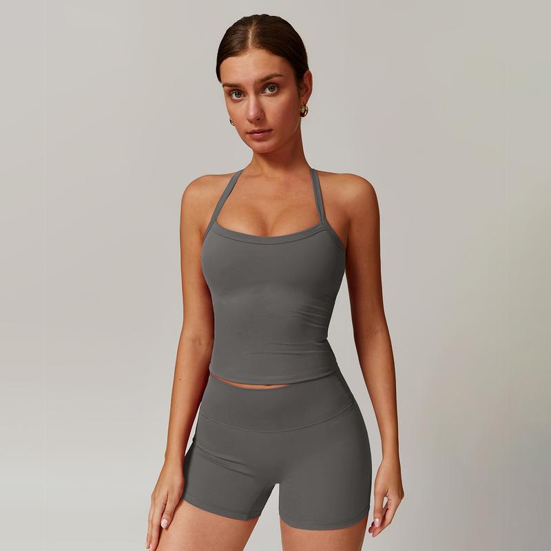 This 2-piece set pairs a sleek spaghetti strap crop cami with high-waist skinny shorts—your new go-to activewear staple!