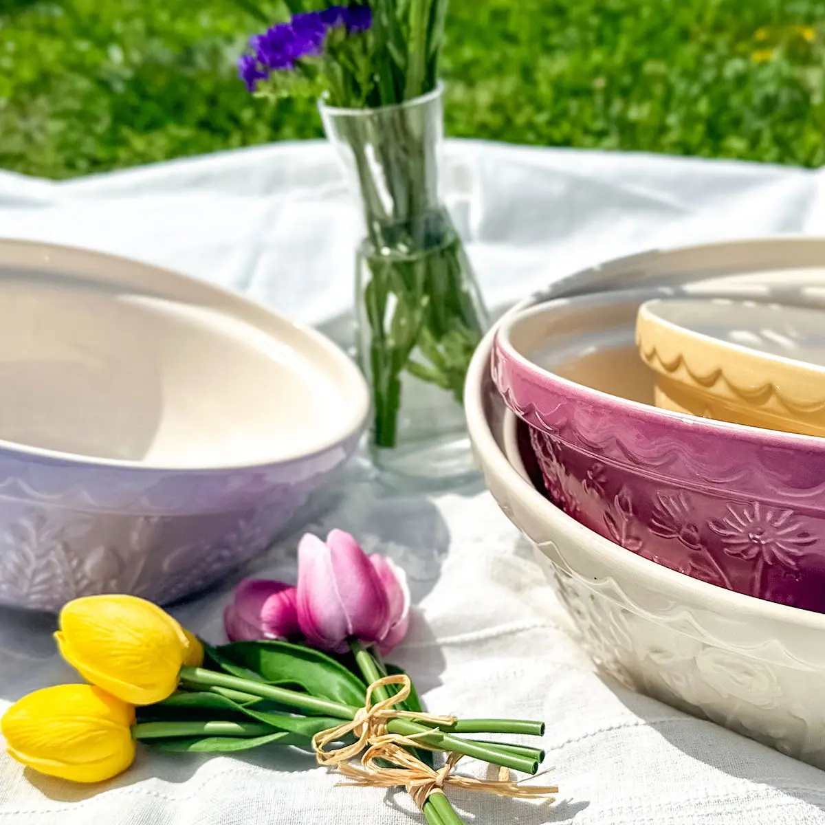 Bring the effortless charm of lush countryside fields indoors with the Mason Cash In The Meadow Collection Mixing Bowl Set. Made with Mason Cash's time-honored stoneware that is resistant to chipping and cracking, this mixing bowl set will be a durably elegant addition to your everyday baking preparation. The complementary ochre and deep marron finishes are highlighted with embossed floral patterns that line the bowls' perimeter, while the classic scalloped rims offer maximum grip - making for practical, elegant pieces that will let mixing tasks go smoother. Allow your baking tasks to bloom with style and order the Mason Cash In The Meadow Mixing Bowl Set Today!