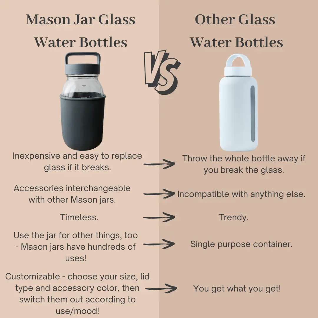 Replaceable: Compatible with other regular mouth quart Mason jars - Ball, Kerr, and some other brands. Unlike other glass water bottles, if you break the glass jar a replacement is easy to find and cheap.