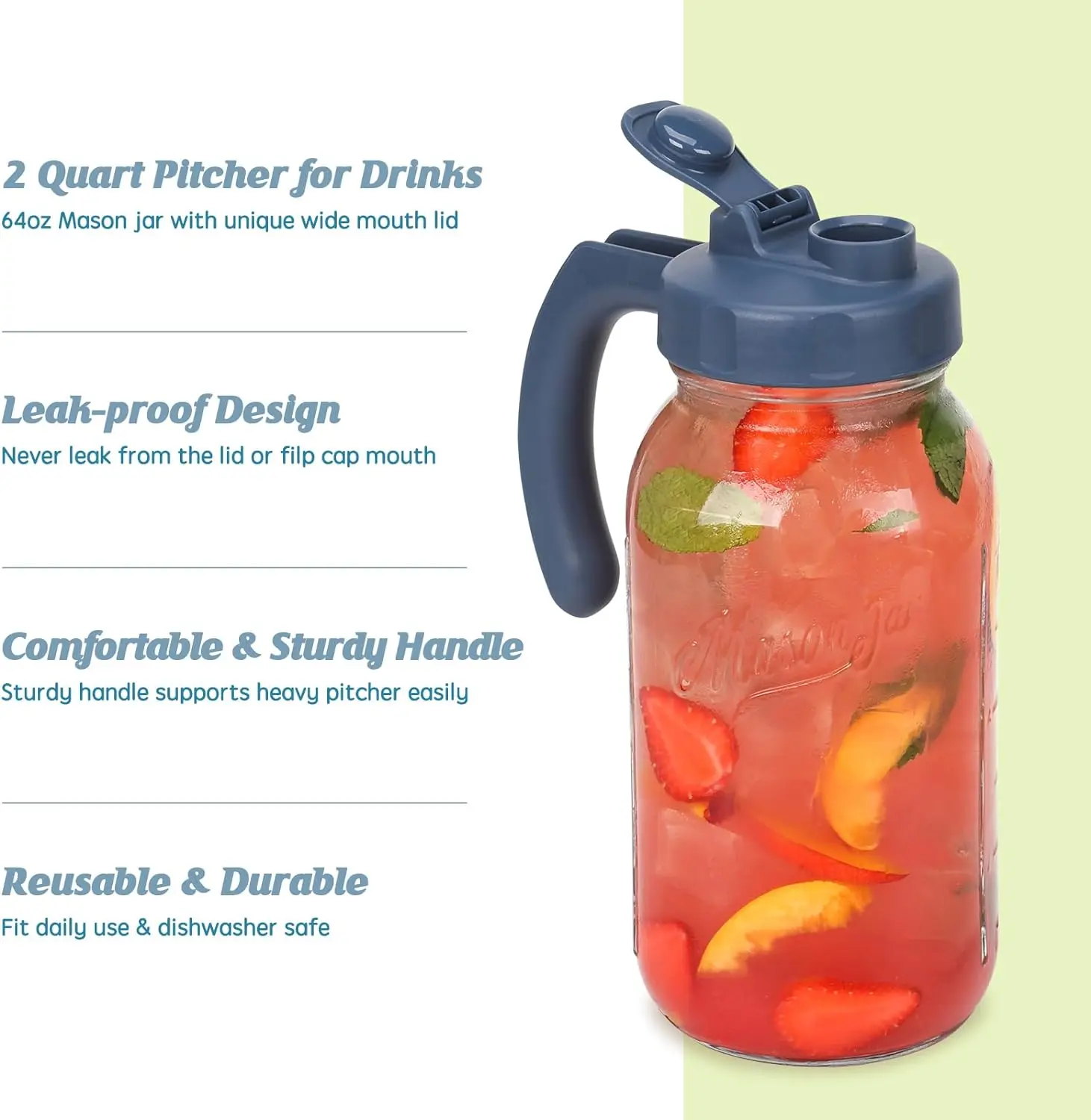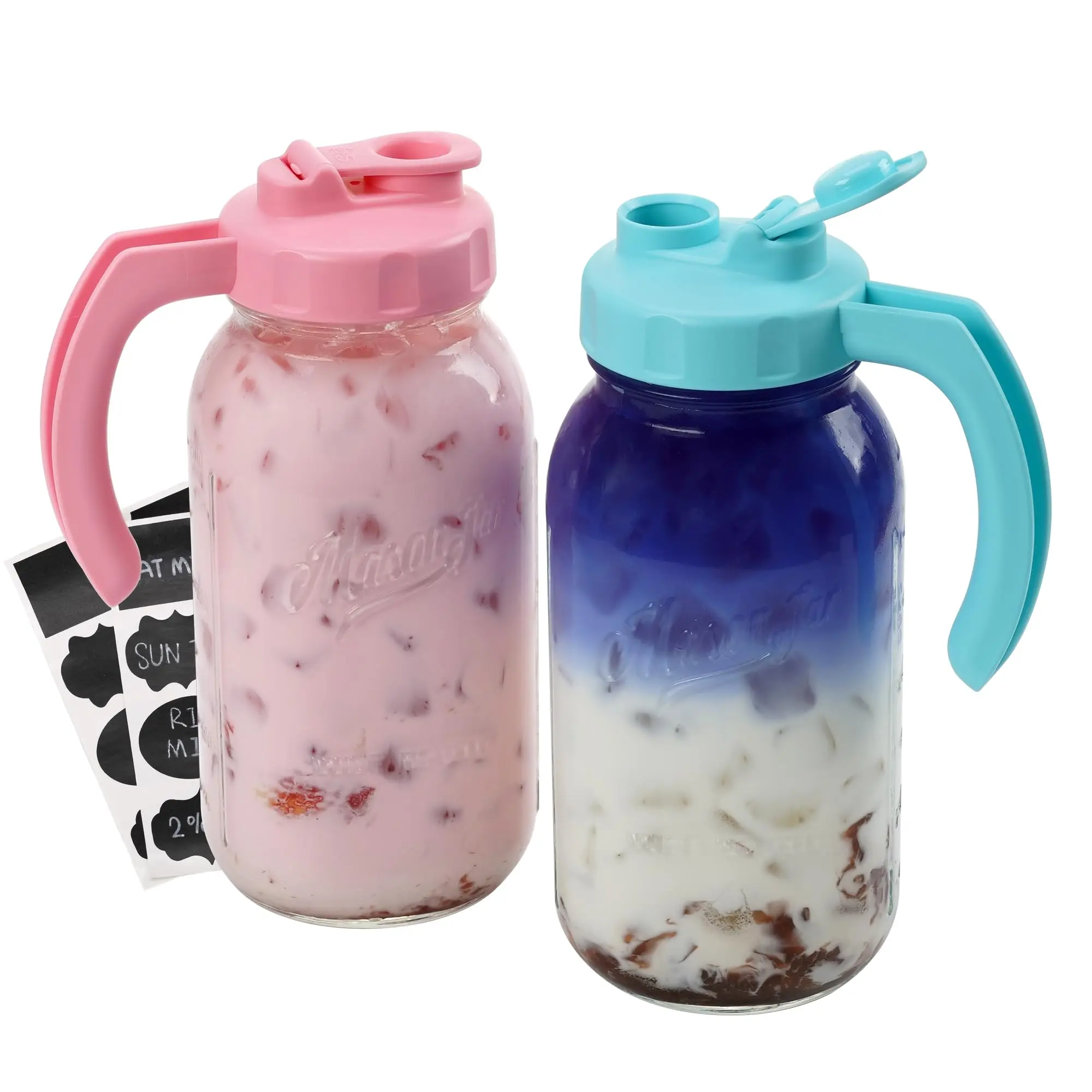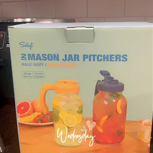 ·2 Quart Glass Container for Homemade Drink - Soligt Glass Pitchers with Lids Sets includes 64oz wide mouth mason jar, Soligt original pour spout lid with handle, vivid yellow and hale navy match various fresh homemade drinks like sun tea, iced tea, kinds of juice, cold brew coffee, milk, creamer and so on. (Bouns: 16 pcs waterproof chalkboard labels for mason jars.)