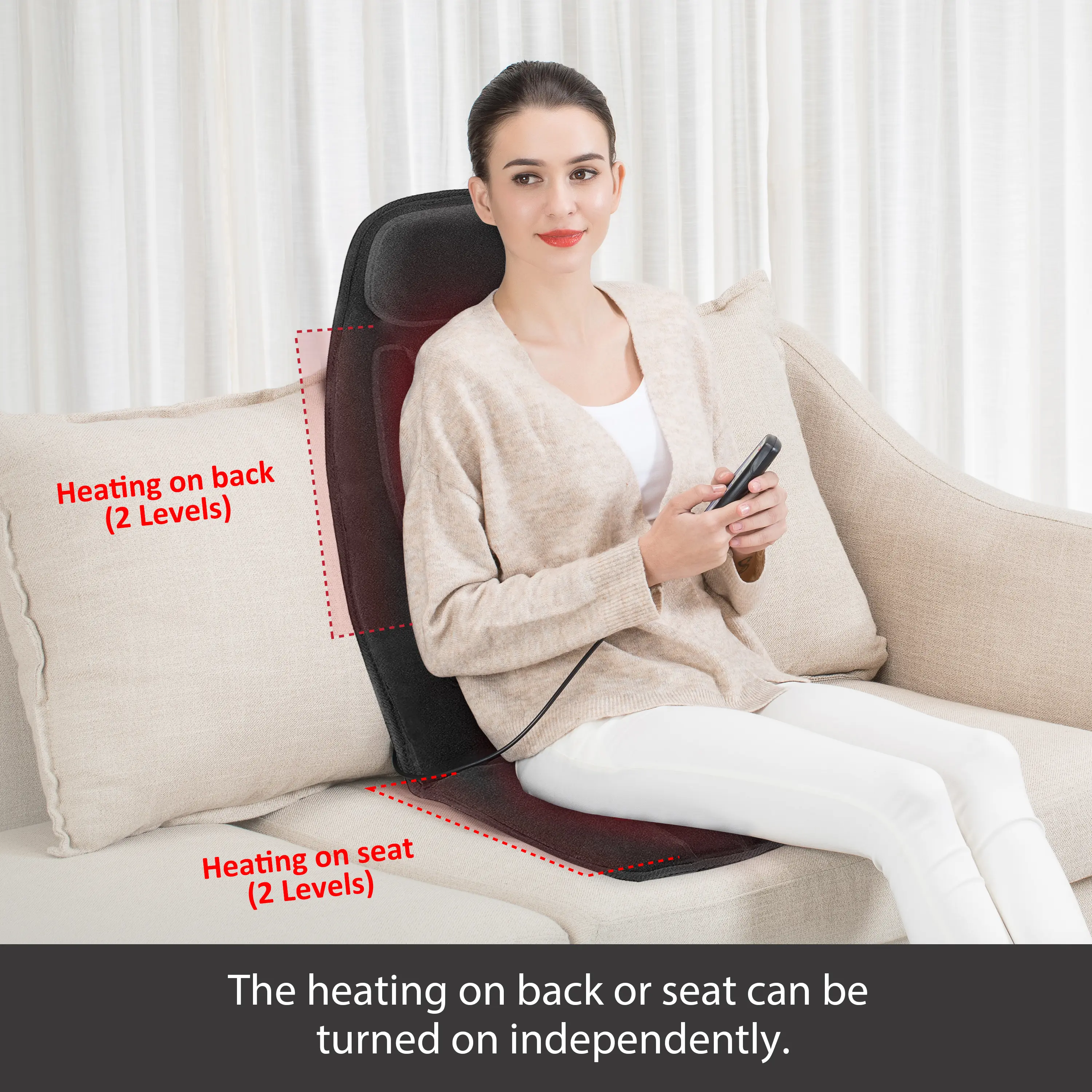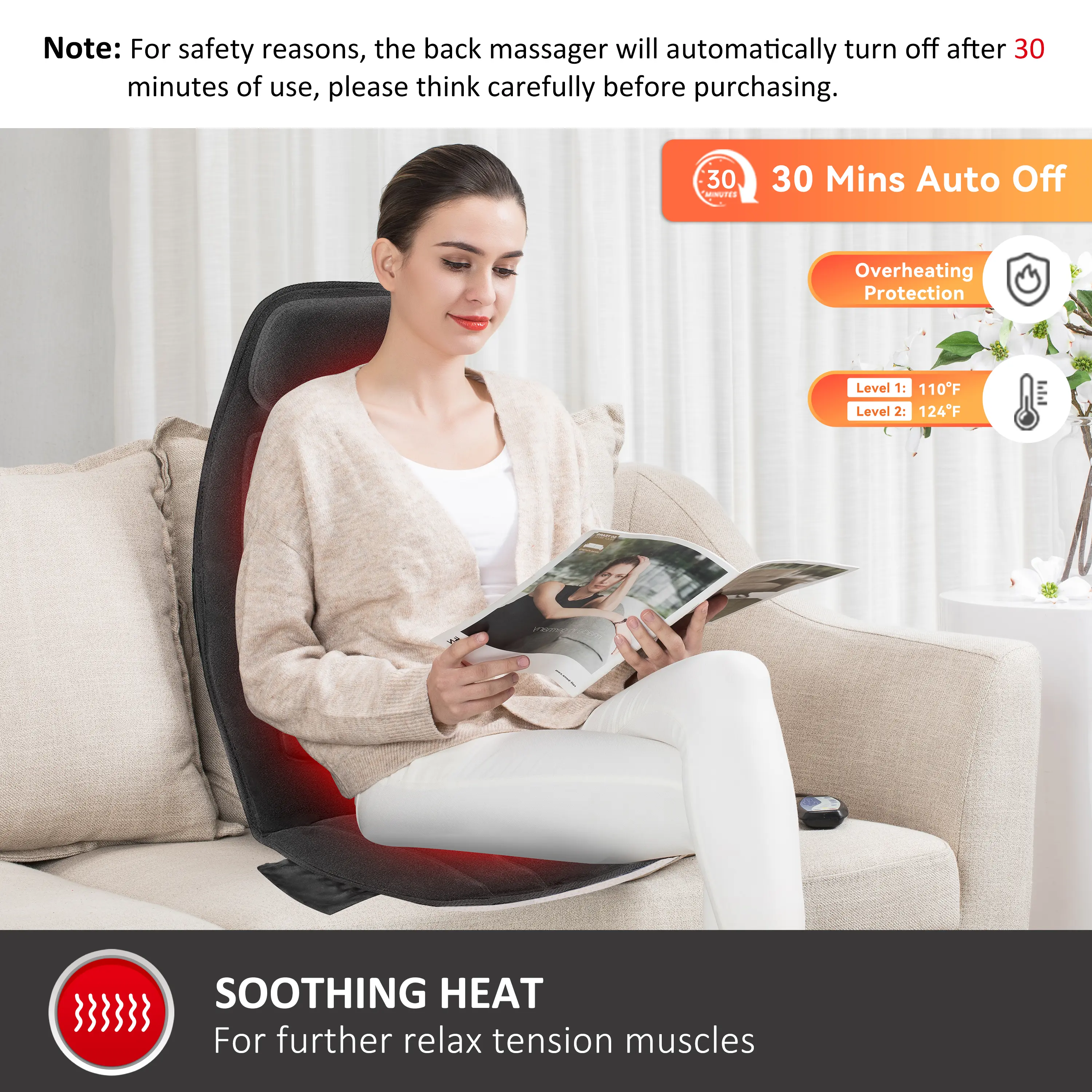 ·Vibration Massage:The back massager with 10 powerful vibrating motors (8 spots for back and 2 for thighs ) and heat function, provides a soothing gentle massage for the back, thighs to help relieve stress, tension. A PERFECT GIFT for Mother's day, Father's day, or birthday gift Christmas gift for your loved ones.