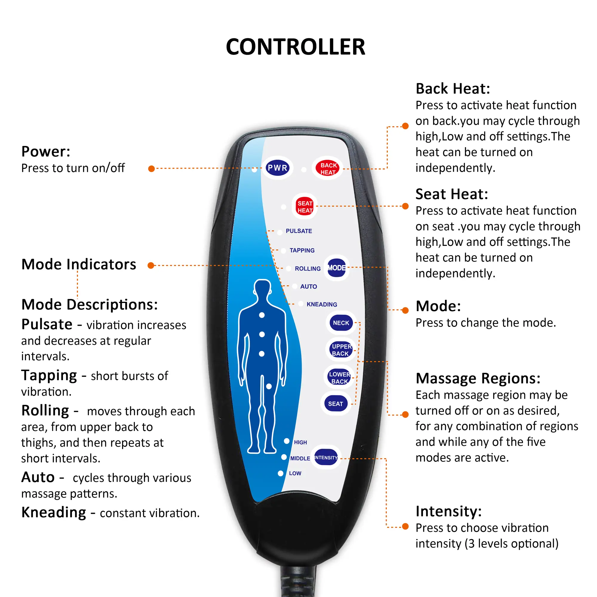 ·Custom Setting:The chair massager allows you to choose a massaging area: Neck, Upper Back, Lower back, Seat, combines all of these areas together, all-inclusive 5 programmed modes and 3 variable massage intensities to give you the best massage you can customize.
