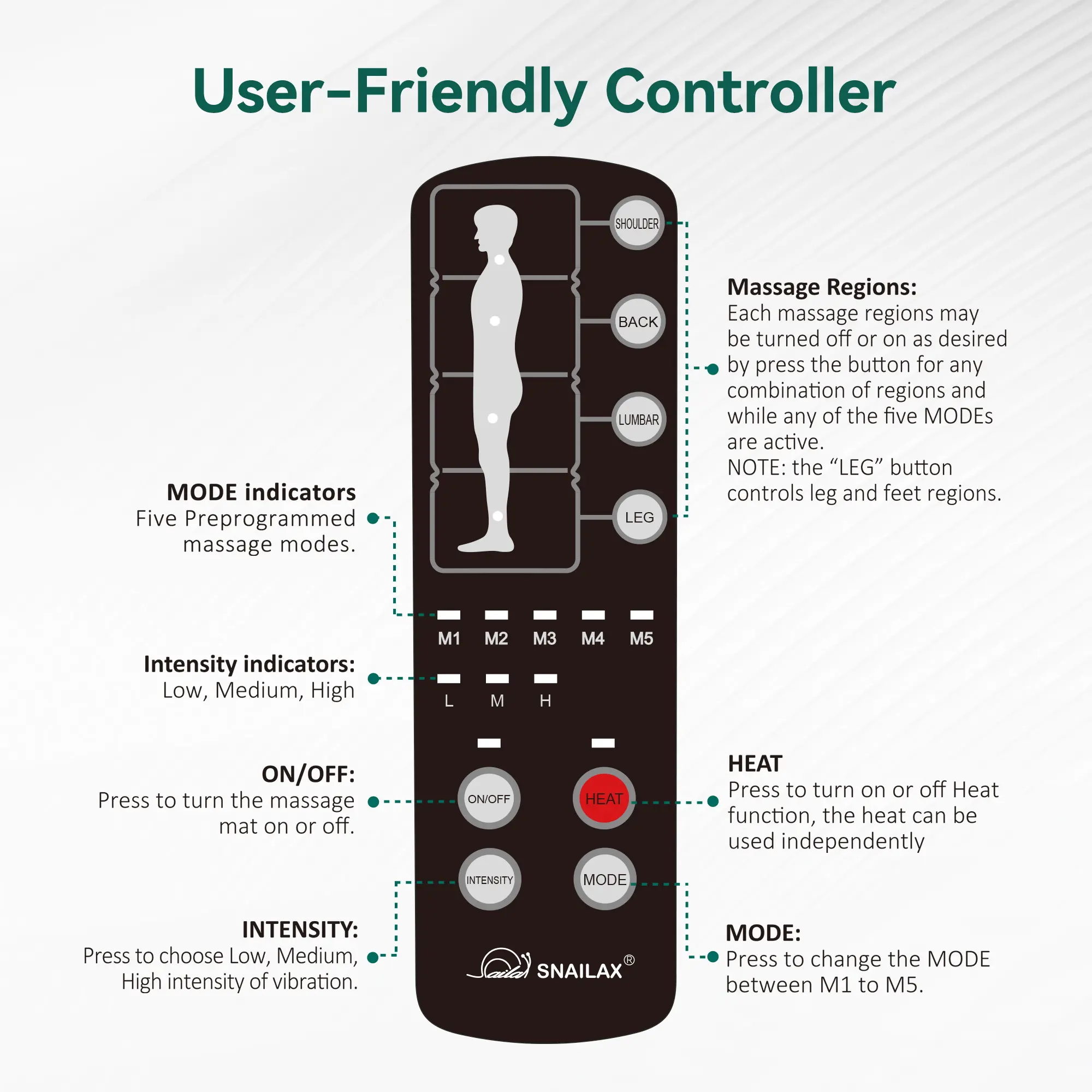 ·【Soothing Heat for Back】Snailax full body massage mat with heat has 2 heating pads to provide soothing warmth for full back to improve blood circulation, relax back tension. The heating function can be turned on separately without massage.