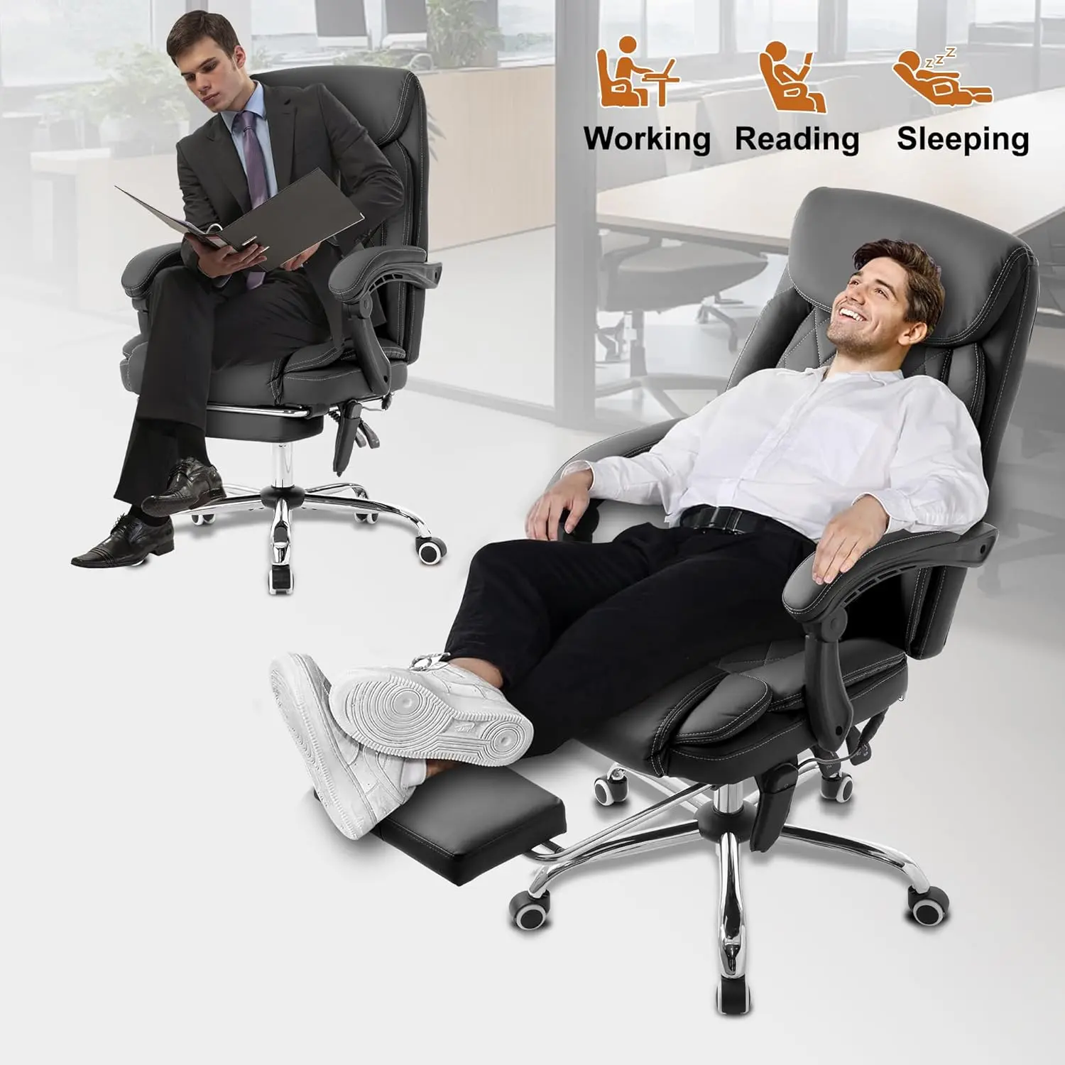 ·【Lunch Break Partner】The backrest of our ergonomic executive office chair can be reclining, when you have rest, put the lumbar pillow on the lumbar area, pull out the footrest, put your hands on the linkage armrests, and you can sleep in peace.