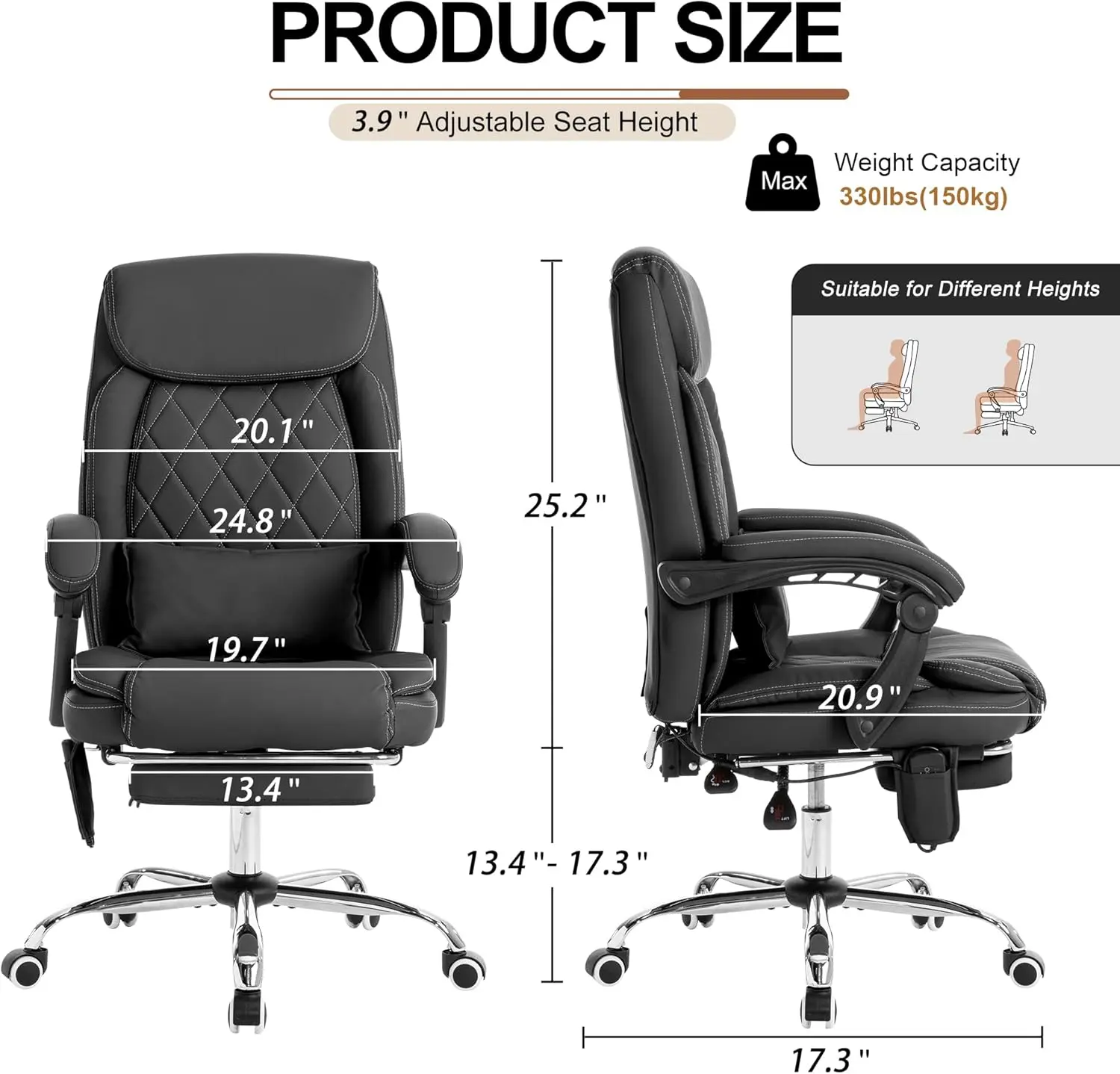 ·【Chair Specifications】Seat area: 19.7"W x 19.3"D. Backrest: 20.1"W x 25.2"H. Seat height adjustment: 13.4-17.3".