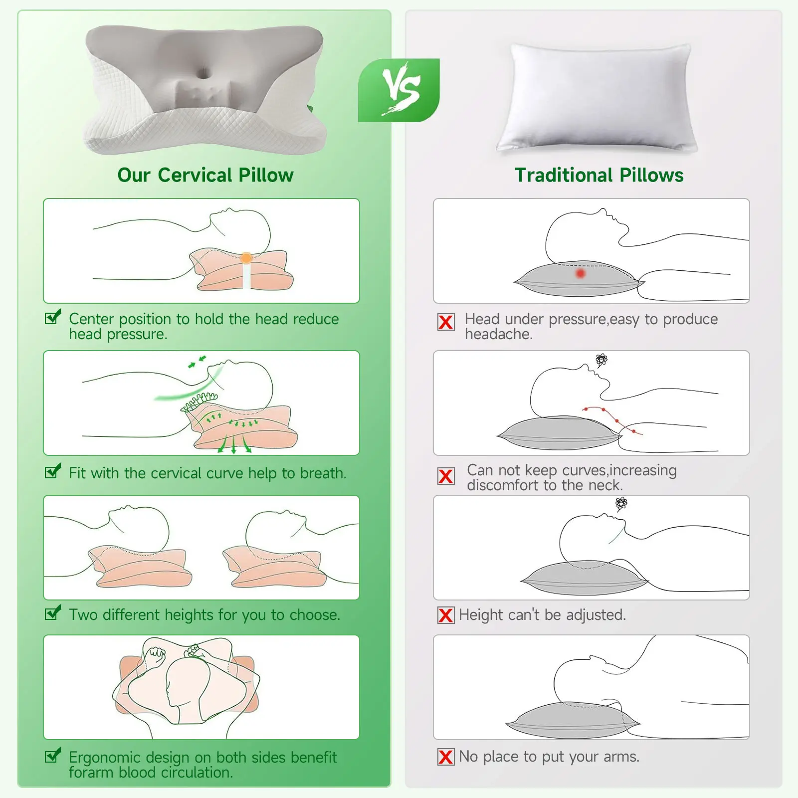 Choose your perfect fit with two height options—8cm for softer, lower support or 13cm for taller, firmer alignment. Whether you sleep on your back, side, or switch positions, it adapts to your needs and keeps your neck parallel to your shoulders.