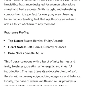 • This body mist offers a premium scent experience, perfect for those who love a sweet, fruity, and addictive fragrance. 🍓 It's ideal for everyday use, adding a touch of elegance to your daily routine. Try it now! 🌸