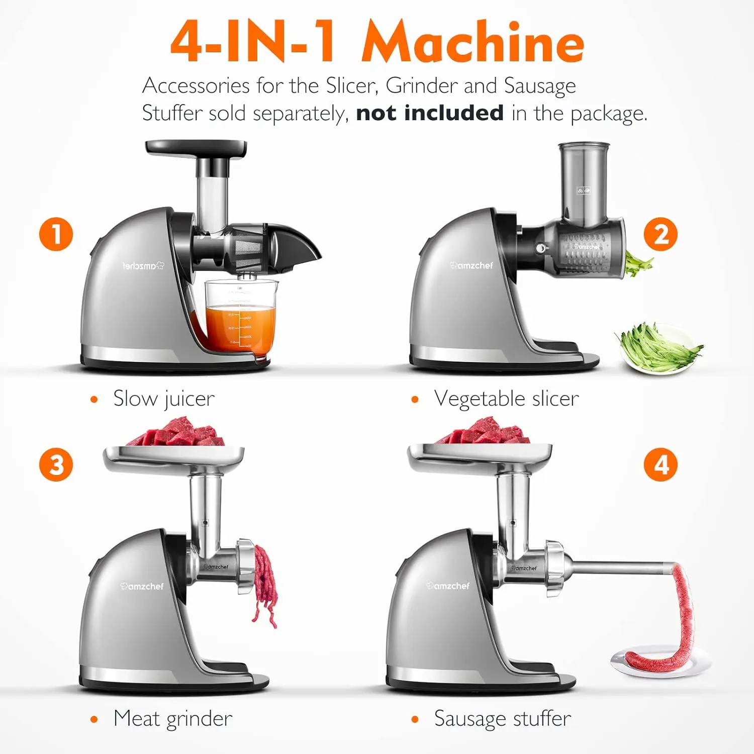 ·【Multi-functional Juicer Masticating】One machine with multiple functions,transform your juicer into a versatile kitchen appliance.It does not only can work as a juicer but also can work as a meat grinder or slicer shredder.Simply insert it to the attachment hub of any AMZCHEF juicer mahicnes.Time to preparing Holiday or birthday gifts for your family or for people who you care.Search “B095C57WHN/B095C3G4CV” to learn more about it!(PS: Attachment need to be purchased separately)