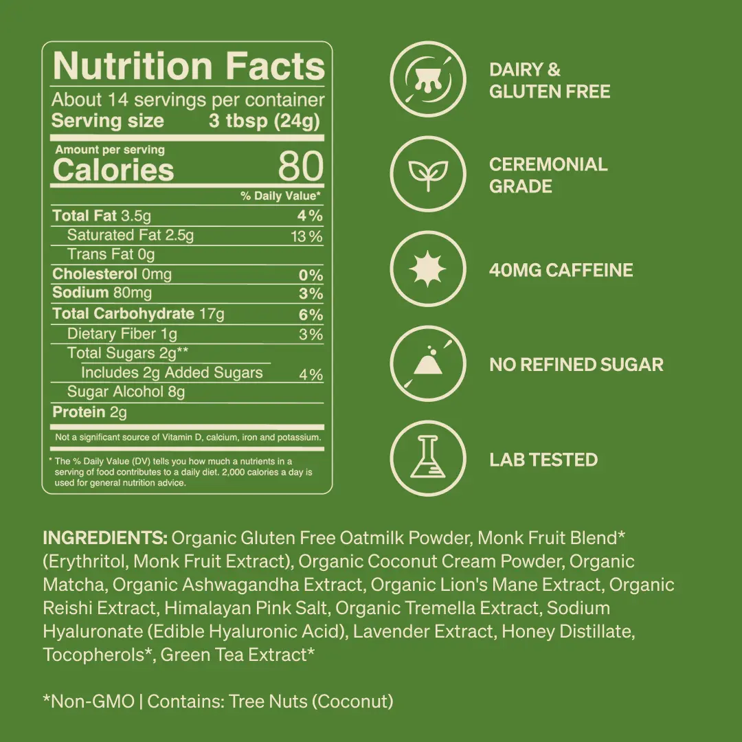 Ingredients: Organic Gluten Free Oatmilk Powder, Monk Fruit Blend* (Erythritol, Monk Fruit Extract), Organic Coconut Cream Powder, Organic Matcha, Organic Ashwagandha Extract, Organic Lion’s Mane Extract, Organic Reishi Extract, Himalayan Pink Salt, Organic Tremella Extract, Sodium Hyaluronate (Edible Hyaluronic Acid), Honey Distillate, Tocopherols*, Natural Flavor, Pistachio Extract, Green Tea Extract*