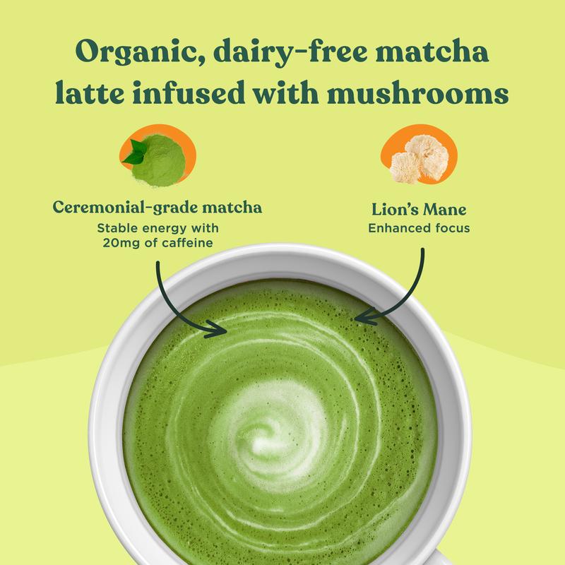 Organic ceremonial grade matcha green tea powder meets productivity pro Lion’s Mane mushroom extract; Superfood moringa joins in for a perfect dairy-free matcha latte.