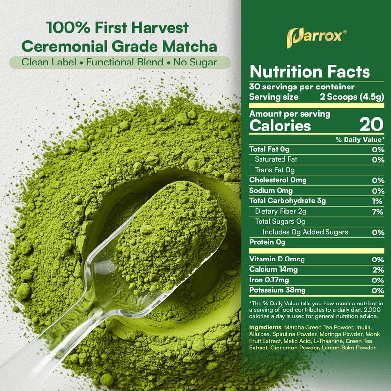 Elevate your tea experience with PARROX All-In Matcha. This ceremonial grade powder supports clean energy, calm focus, and metabolic wellness. Each 30 servings pack is crafted from 100% first harvest Japanese tea blended with seven functional superfoods for a convenient all-in-one boost. Perfect for those seeking a premium matcha experience.
