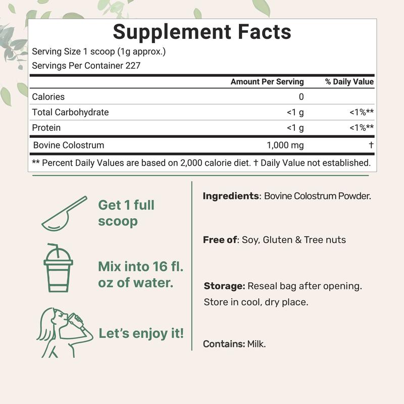 Pure, Instant Bovine Colostrum Powder. Enjoy top-grade mother’s first milk that is sourced from natural pasture-raised, grass-fed bovine, providing 227 servings per 8-ounce supply.