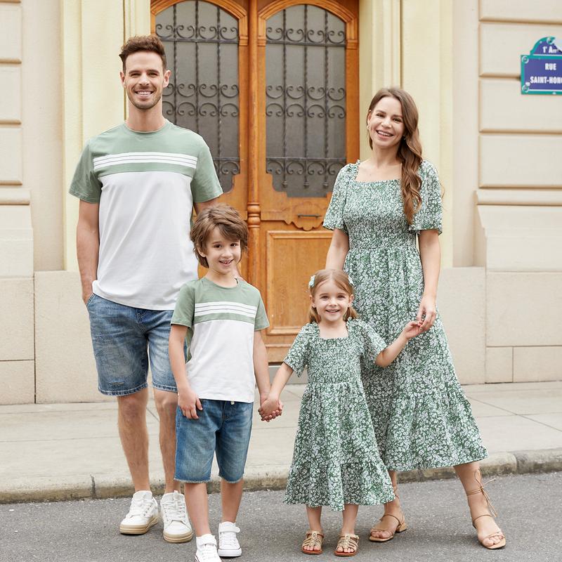 ·Elevate family style: This floral tiered dress and colorblock t-shirt set makes your family stand out. Perfect for casual spring and summer occasions. 🌸
