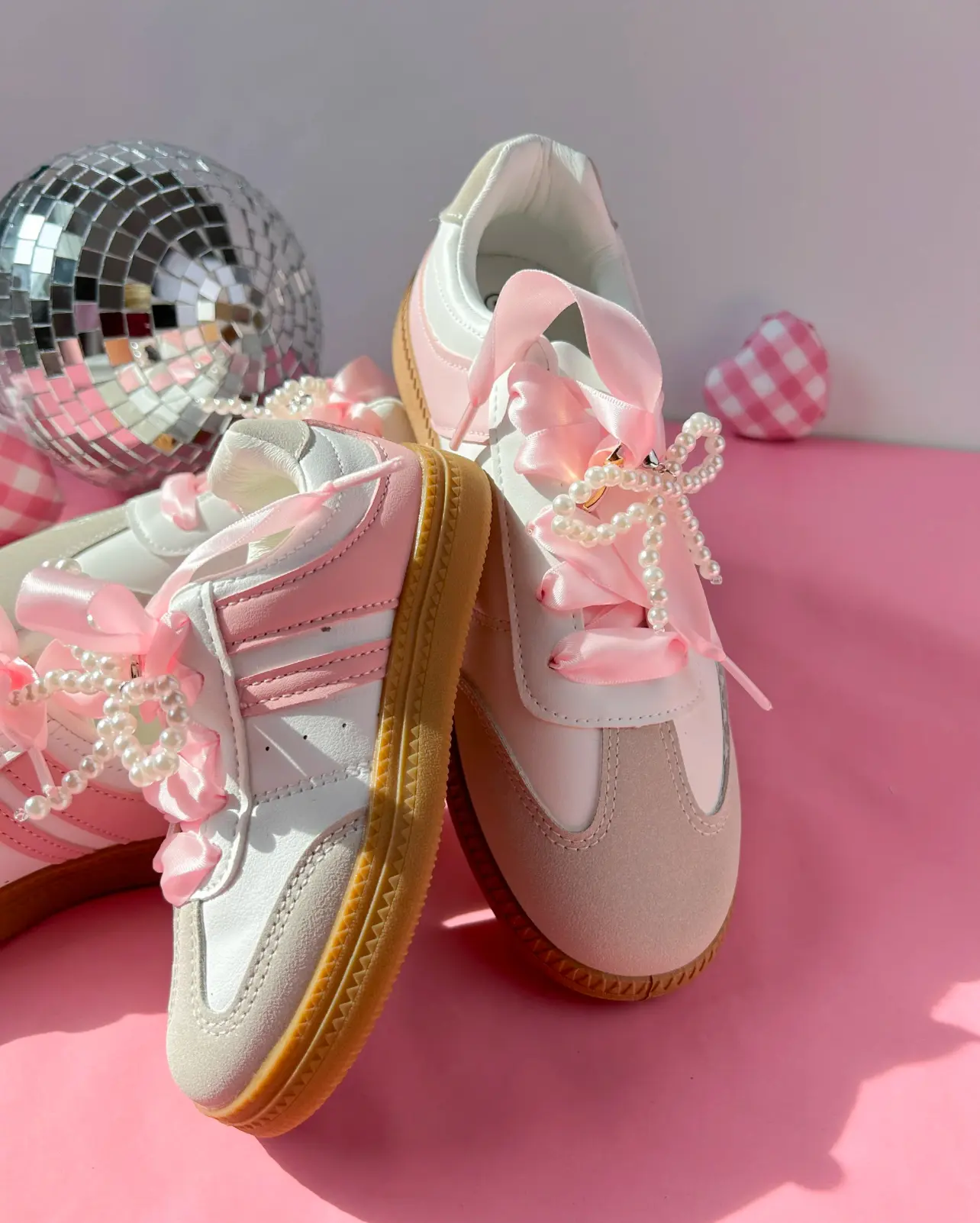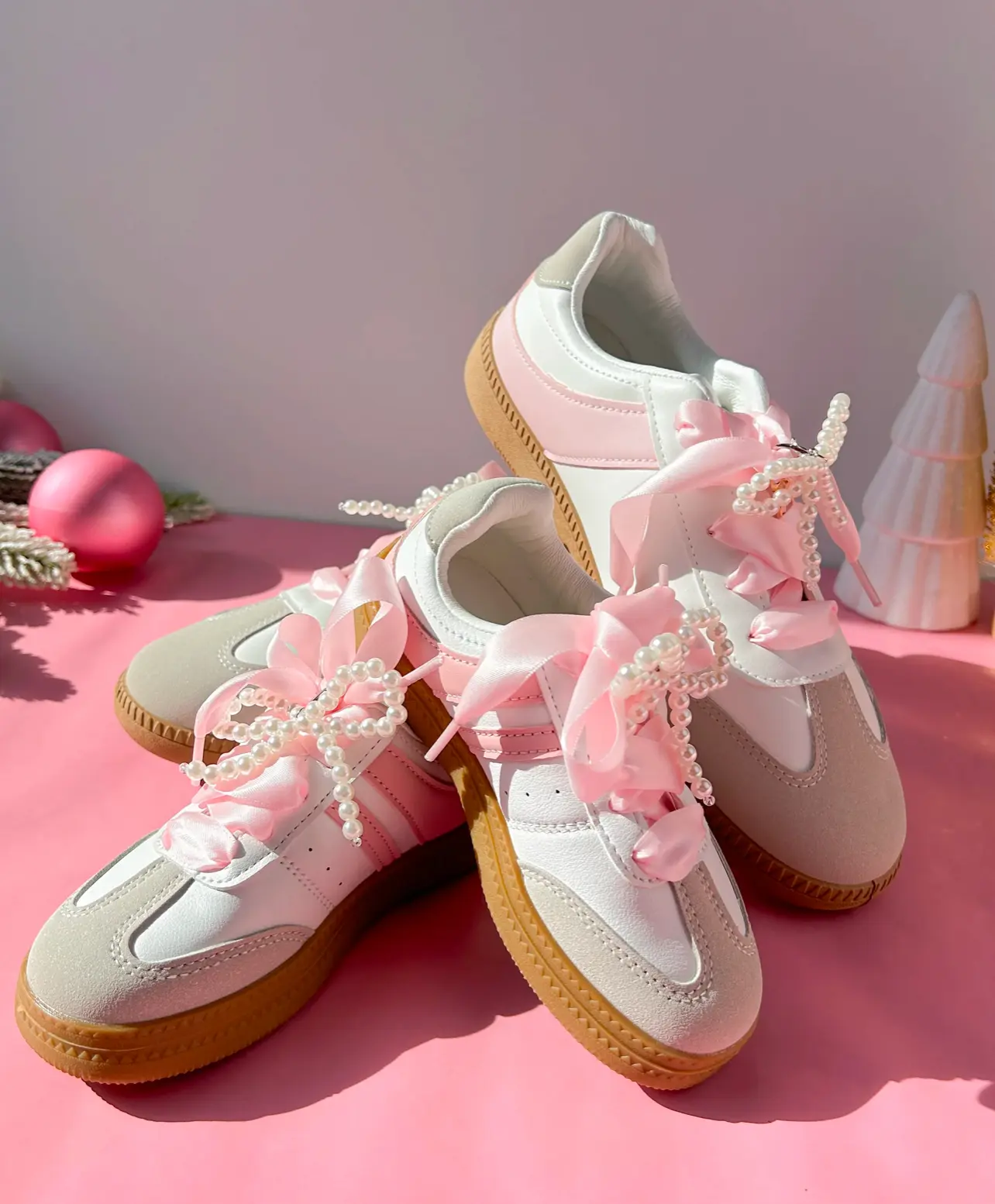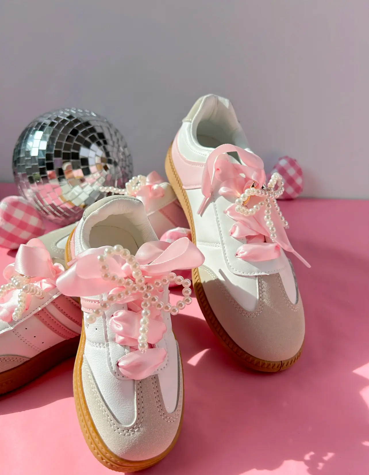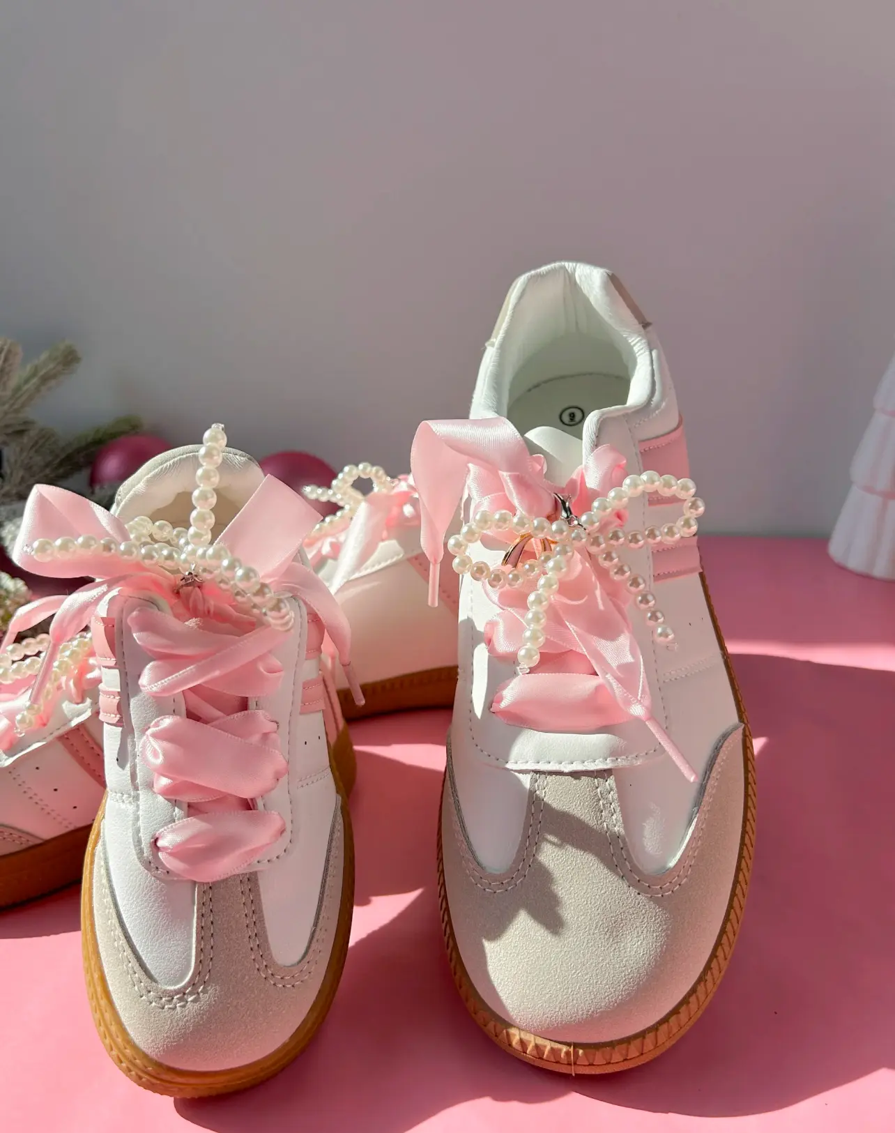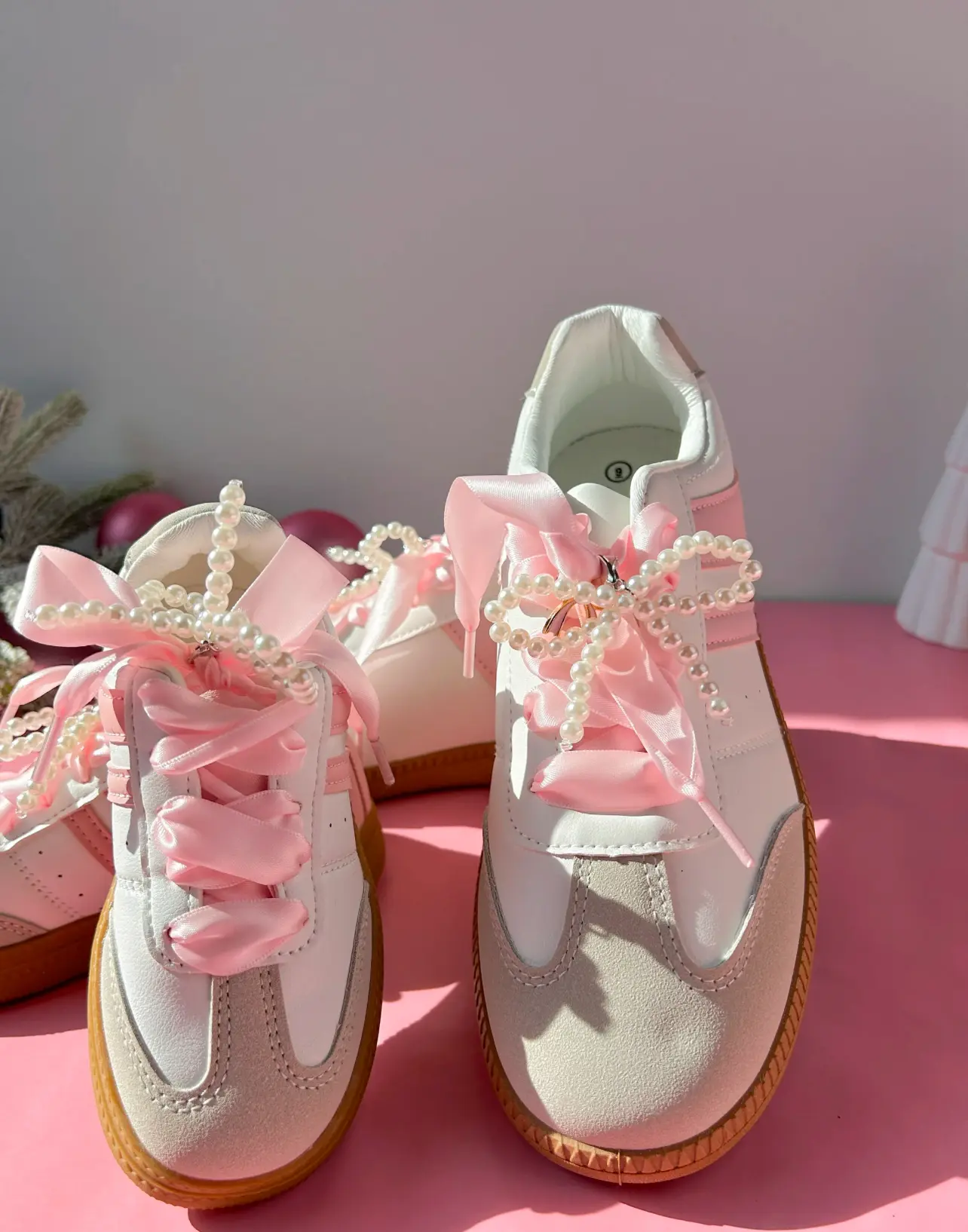 ·Faux Pearl Bow: A unique faux pearl bow adds a playful and stylish element, making these sneakers visually appealing and fun.