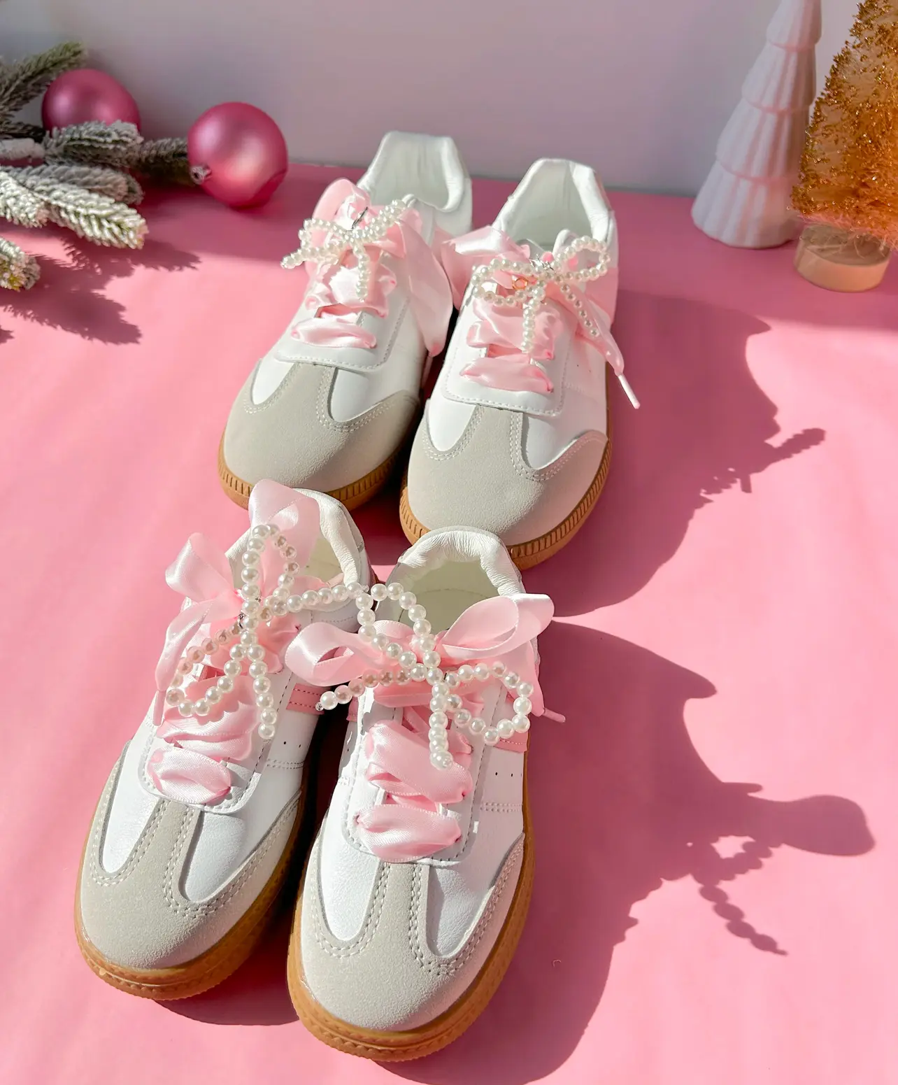 Celebrate your love for your little one with these charming White Pink Mommy and Me Sneakers. Designed with a delightful satin ribbon shoelaces, these sneakers add a touch of elegance to your child's footwear collection.
