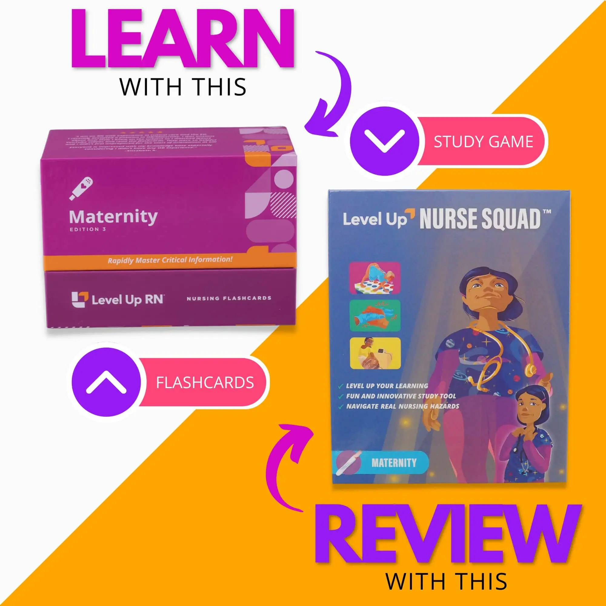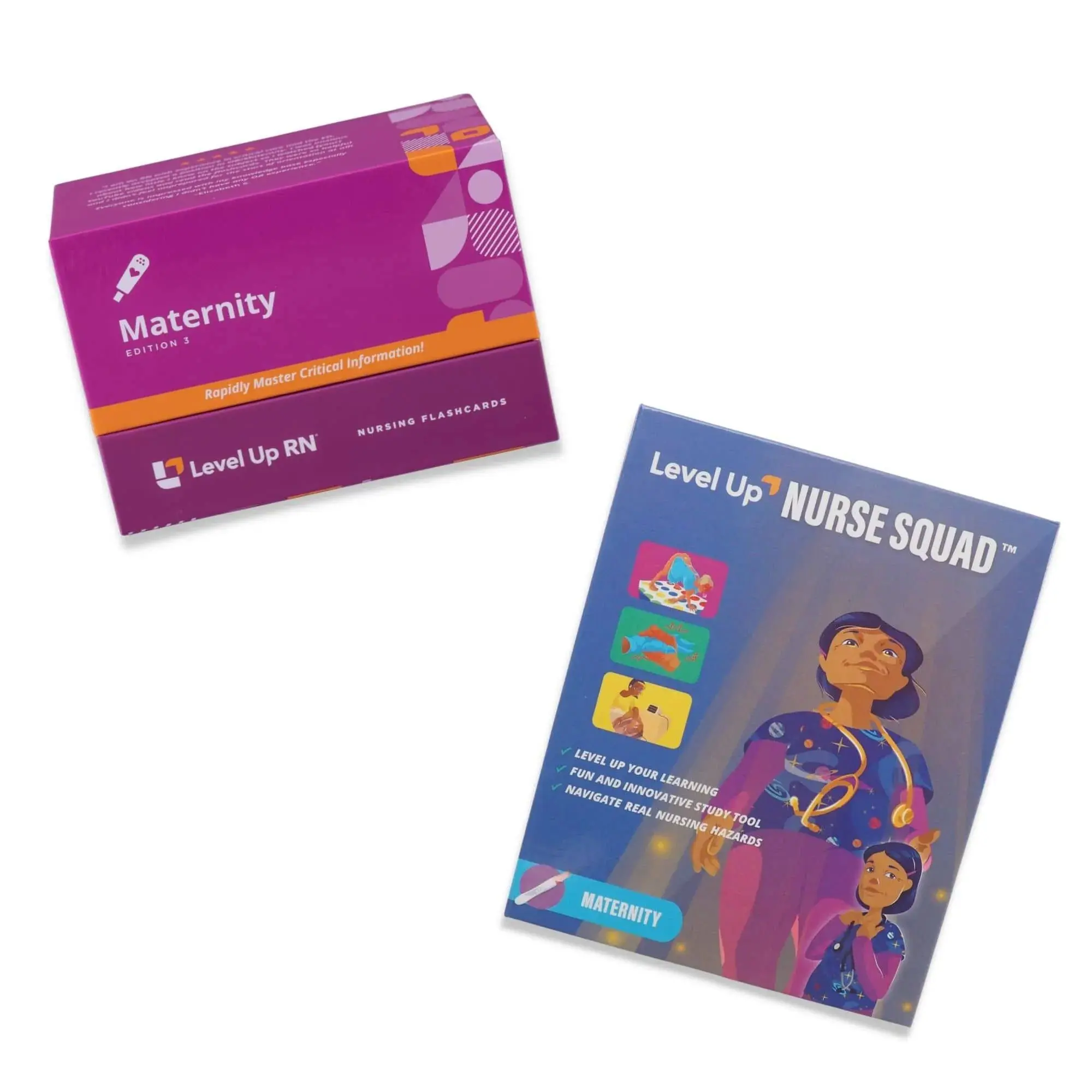 Inside the box, you get the full set of maternity flashcards and the Level Up Nurse Squad - Maternity card game—no batteries or extra materials needed. Just open, study, play, and conquer.