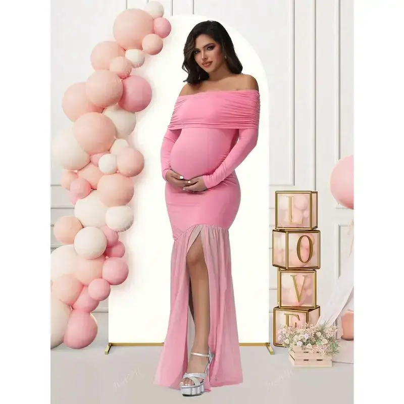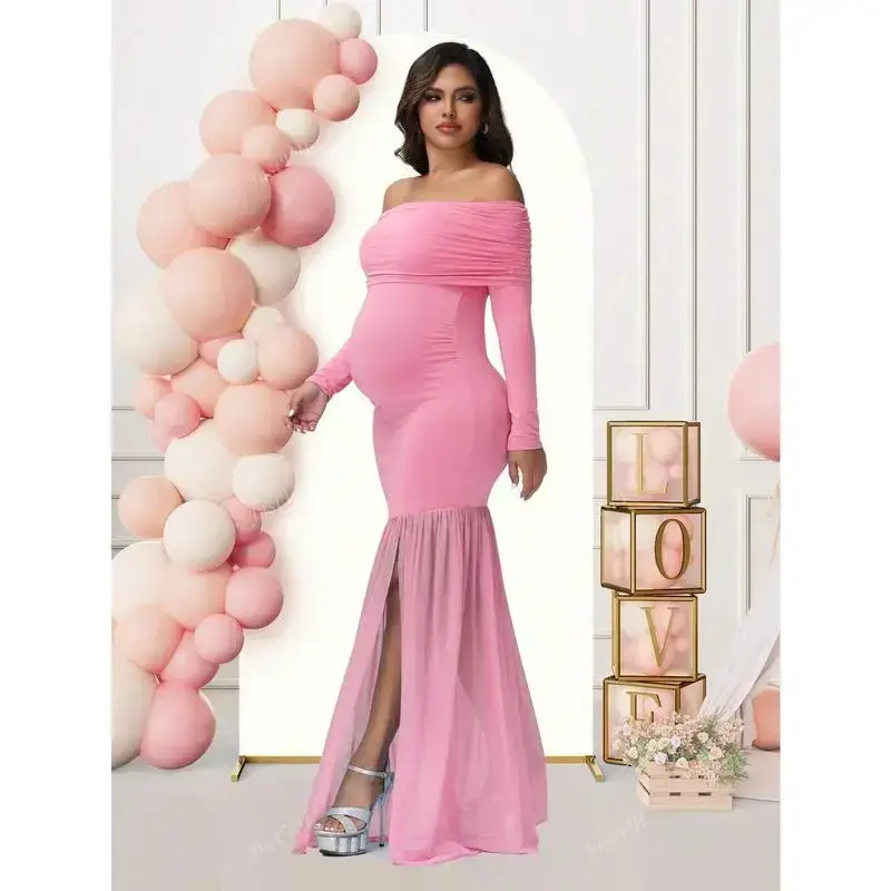 Maternity long sleeve off shoulder dress solid color mesh panelled split hem gown for baby shower photosparty party
