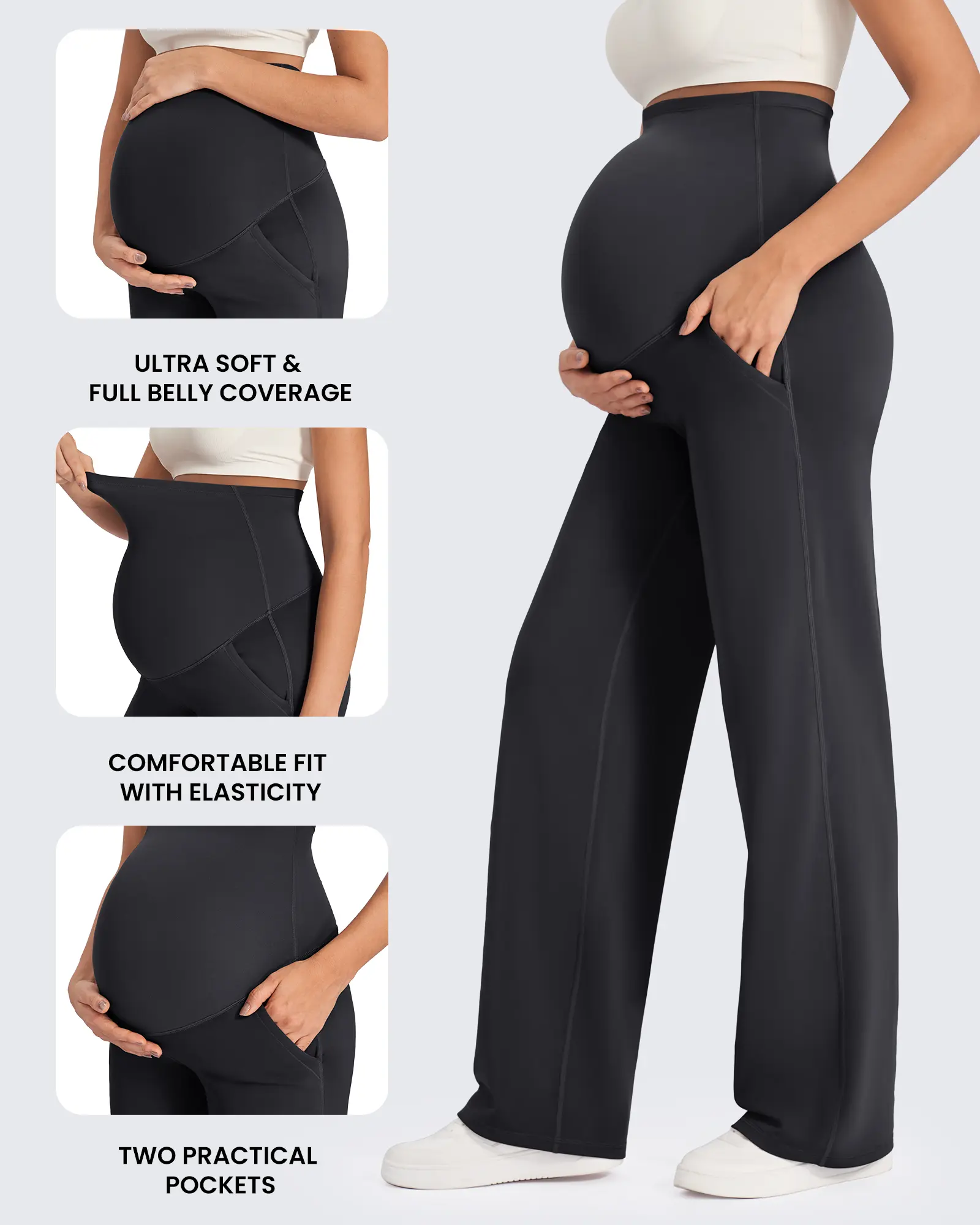 Experience the perfect blend of comfort and style with our maternity wide leg pants, designed to provide comprehensive support throughout your pregnancy. Made from luxury fabric nylon 66, these pants offer a skin-friendly embrace that adjusts comfortably as your belly grows.