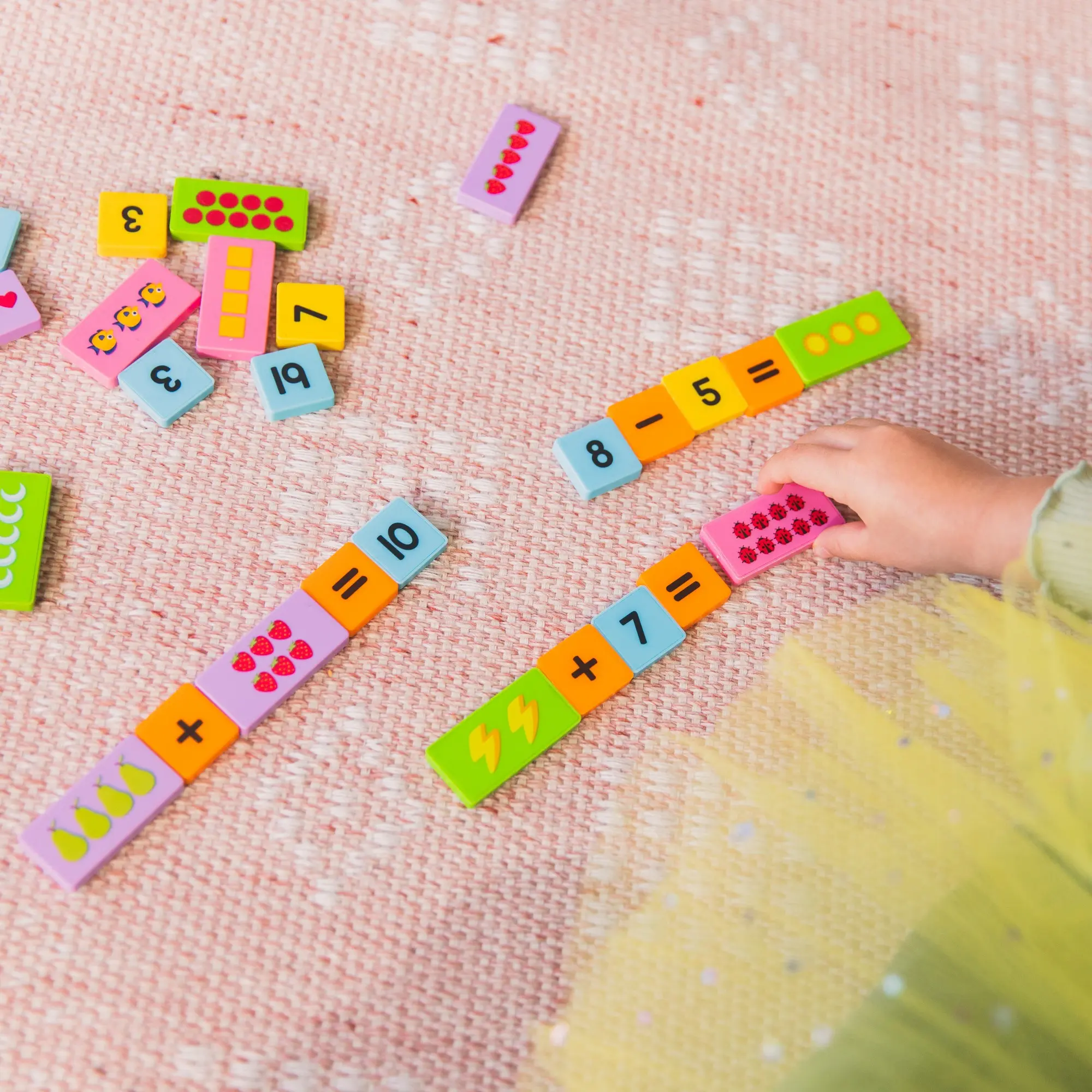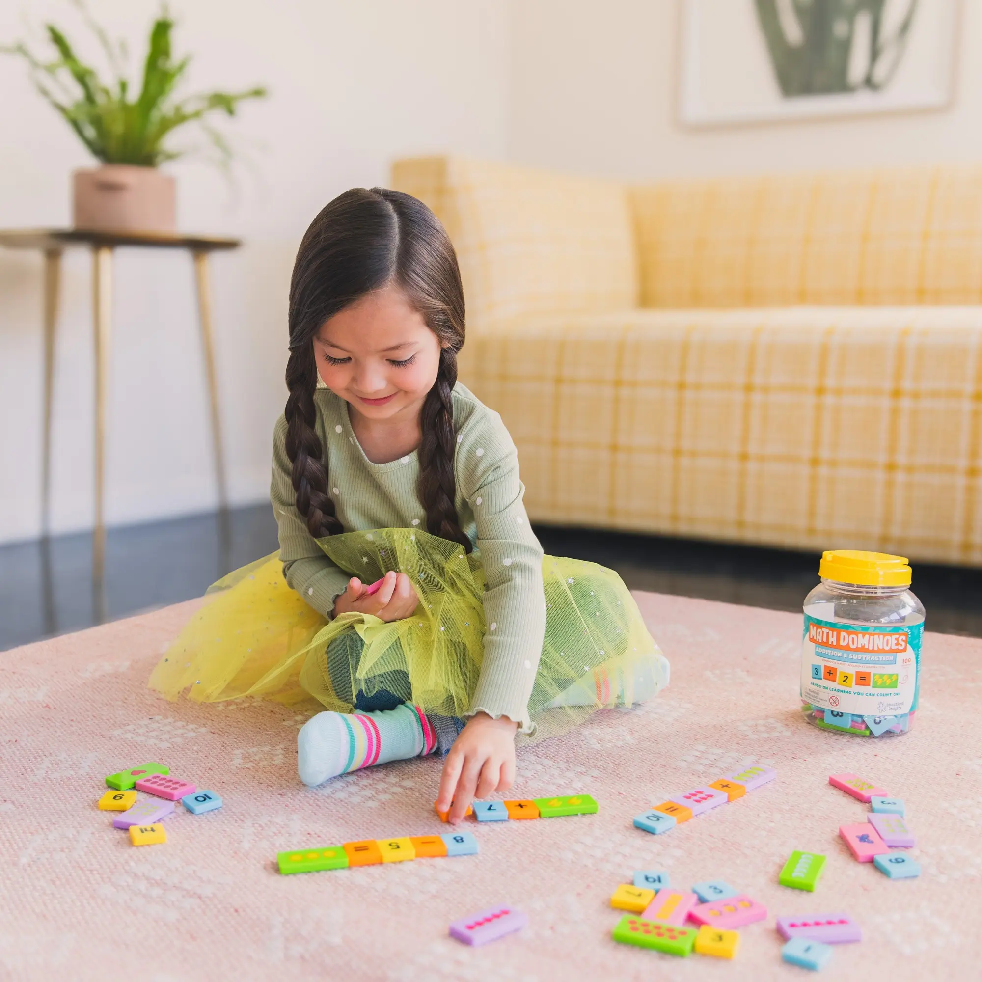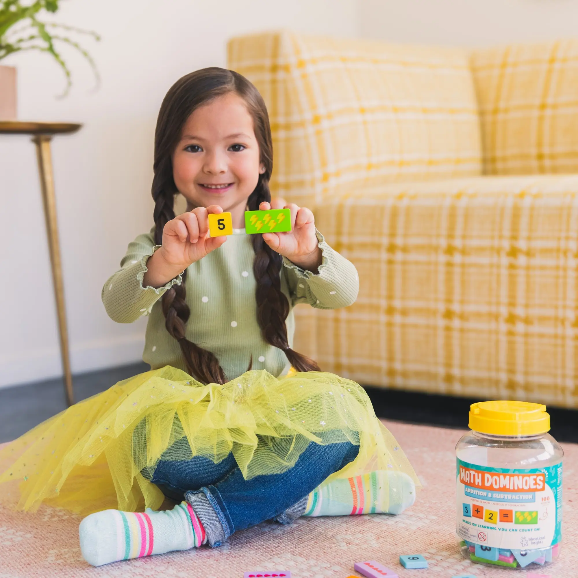 DOMINOES SET INCLUDES: 60 Number and math symbol dominoes (1" x 1"), 40 math picture dominoes (1" x 2"), storage bucket, and activity guide. Ages 3+