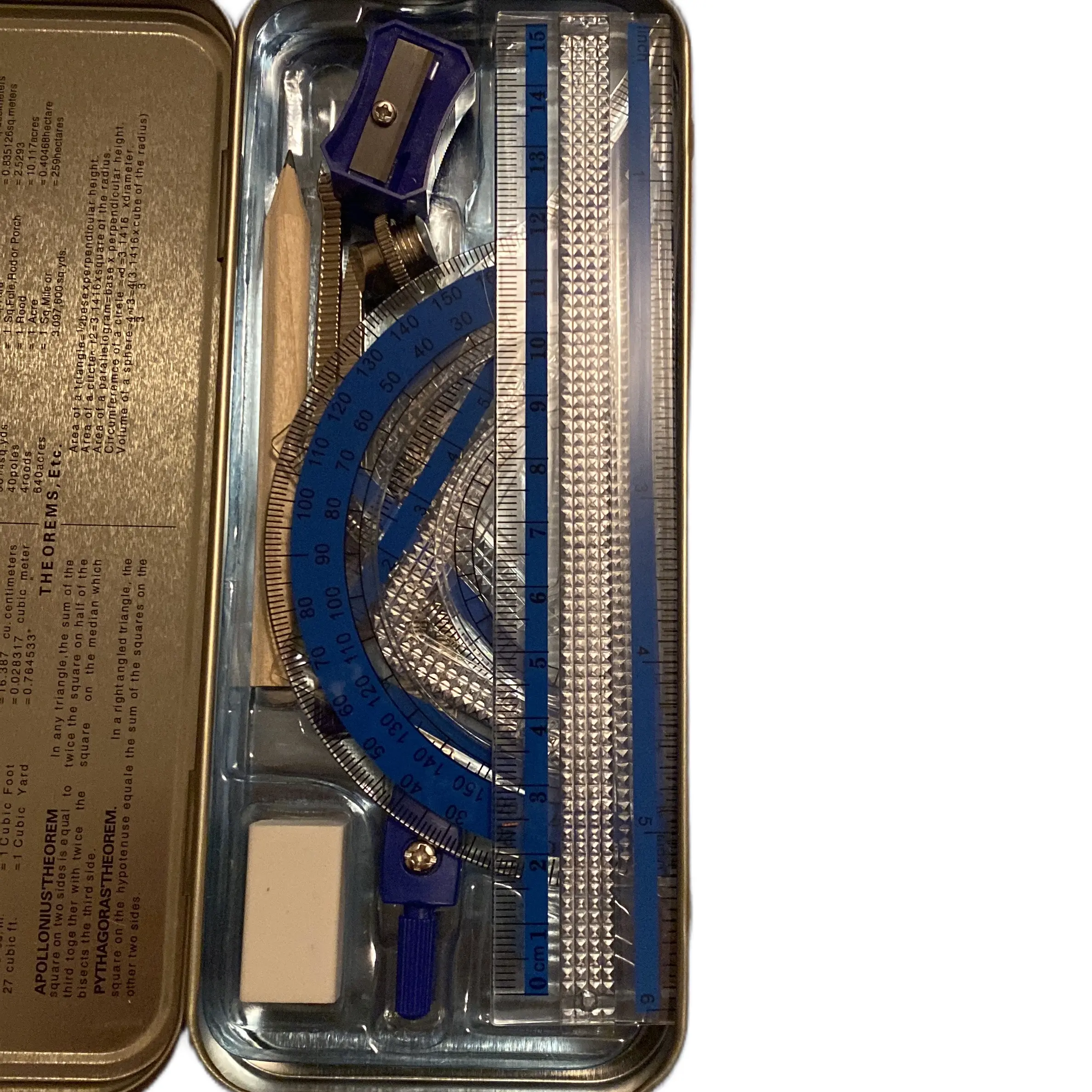 Math kit for students or math people. Compass, protractor, eraser, sharpener, angles,