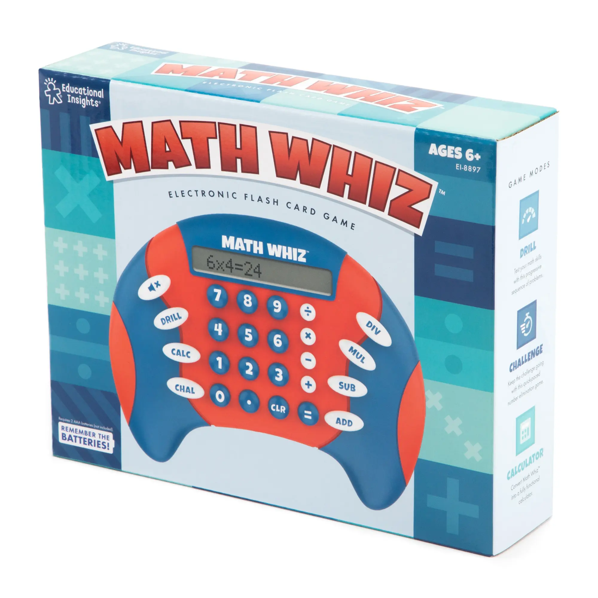 ·WHAT'S INCLUDED: Math Whiz is a hand-held electronic game with three modes of play (Drill, Challenge, and Calculator) that quizzes kids on addition, subtraction, multiplication, and division facts at 8 difficulty levels for each skill. Requires 2 AAA batteries (not included).