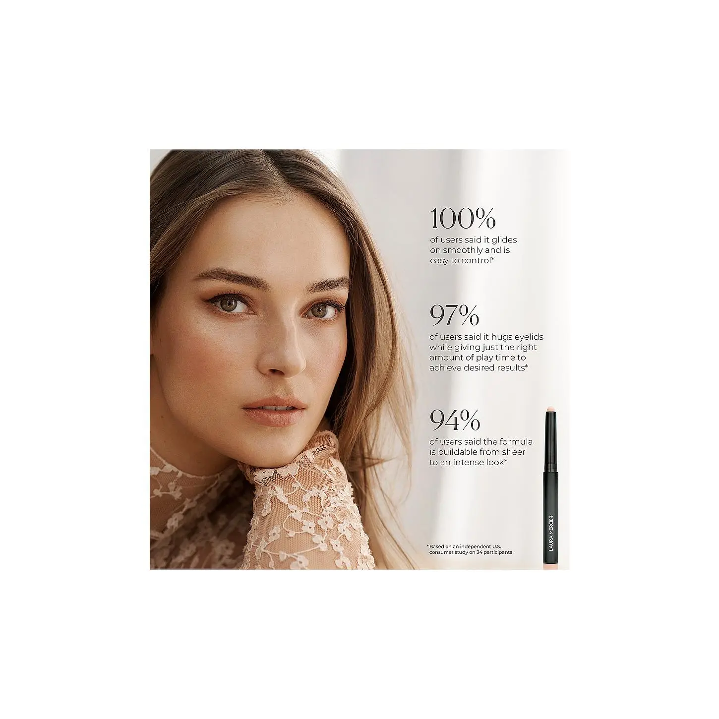 ·A 24-hour long-wear, creamy-matte eyeshadow stick that effortlessly glides, blends, and builds on lids without tugging, flaking, or creasing