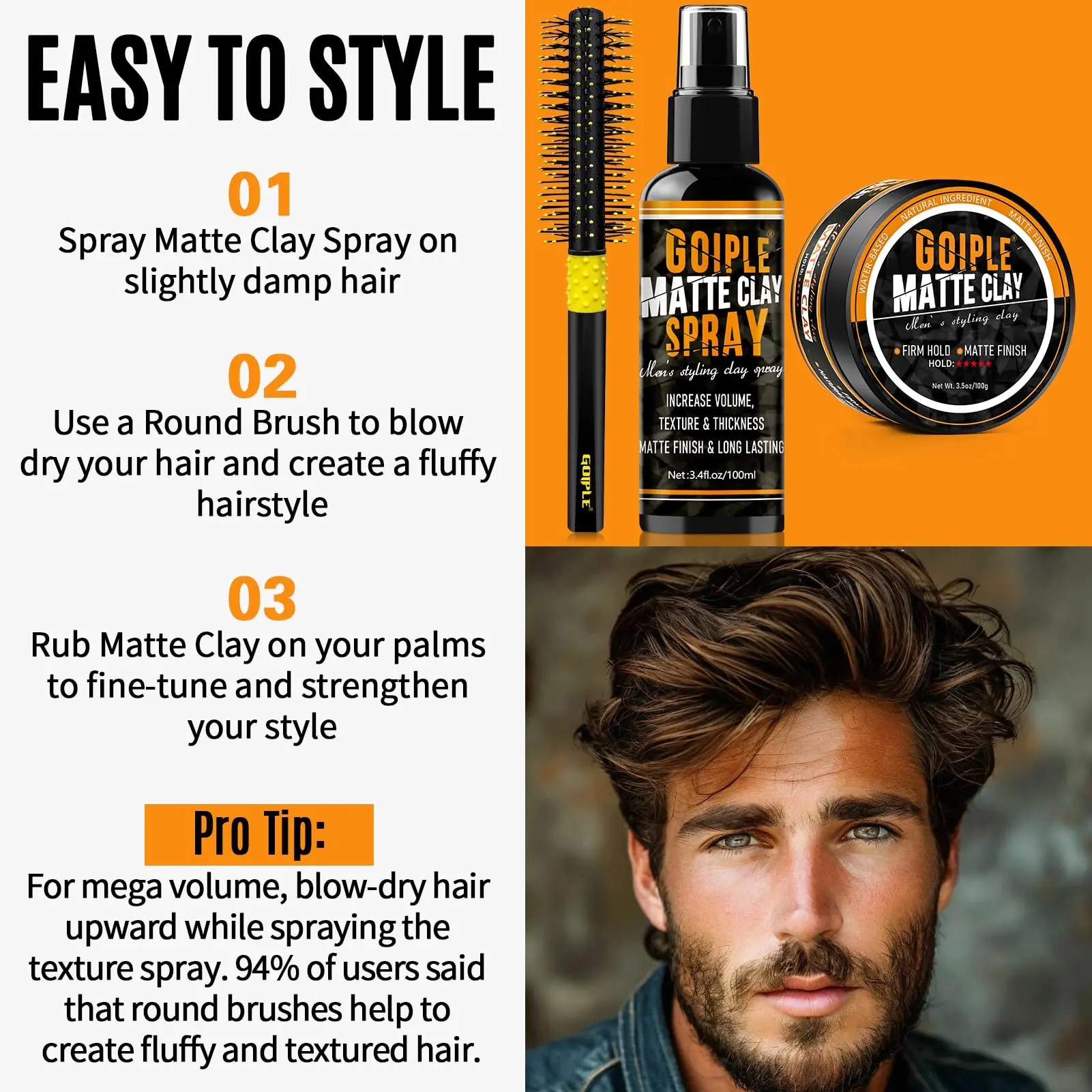 ·Texture & Volume Duo: Pair our matte clay hair product men trust with your favorite round brush for instant lift. Our matte clay absorbs excess oil and ensures even distribution of hair. Ideal for fine/thinning hair needing dimensional body
