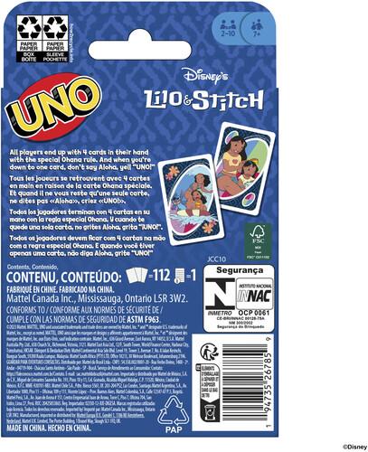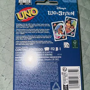 Summary:Fans of Disney's Lilo and Stitch will love playing with this themed UNO card game.With a deck featuring graphics inspired by favorite characters and scenes, players try to match colors and numbers -- there's even a special 'Ohana' rule that ends up with all players having four cards in their hand! And when down to a last card, don't forget to yell 'UNO!'Makes a great gift for fans of Disney's Lilo and Stitch and card game lovers ages 7 years old and up.Features:The UNO game players love features graphics inspired by characters from Disney's Lilo and Stitch.Game play matches the classic card game where players match colors and numbers to get rid of all their cards.The special 'Ohana' rule lets players with more than 4 cards in their hand discard down to 4, and player with less than 4 cards in their hand draw up to 4.When down to one card, don't say, 'Aloha' -- shout 'UNO!'Designed for 2 to 10 players ages 7 years and older, the collectible card game makes a great gift for fans of Disney's Lilo and Stitch!Includes 112 cards, and instructions.Ages 7Y+2-10 playersColors and decorations may vary.