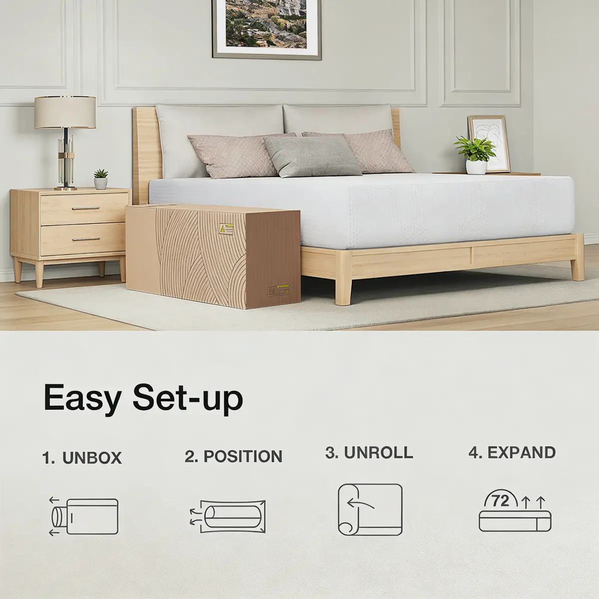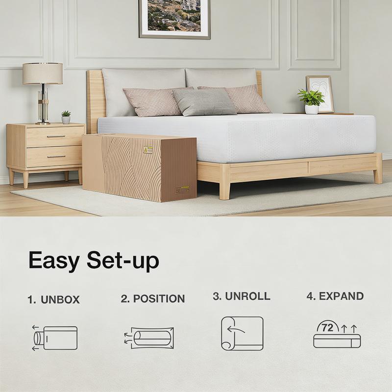 memory foam queen mattress is vacuum-compressed and packaged in a compact box for easy delivery. Easy to setup , even on the floor. Mattress is recommended 72 hours for air out and reshape.
