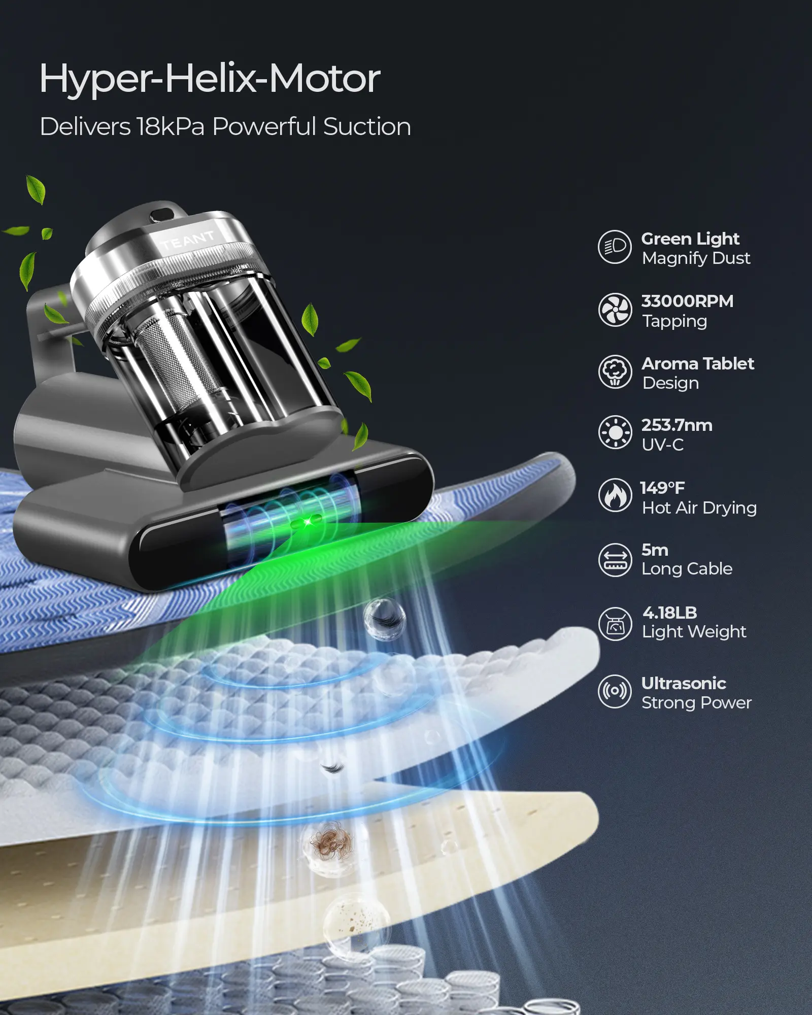 Green Light Detection, No Dust Hides:Teant powerful mattress bed vacuum cleaner uses 555nm green light and lens technology to reveal hidden dust, pet hair, and microparticles on dark mattresses, sofas, and deep fabric crevices, leaving no spots missed; extra-long 5-meter cord reaches every corner of a king-size bed without unplugging, experience simpler, smarter, and more thorough cleaning