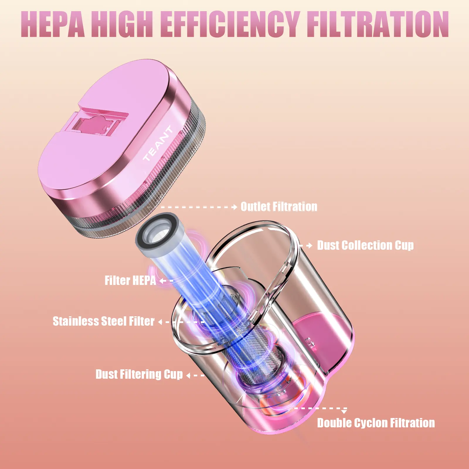 HEPA Integrated Dual Dust Cup Filtration System:Equipped with HEPA integrated dual-cup filtration system,the bed vacuum cleaner can filter 99.97% of particles(0.3 microns). The integrated dual-cup can effectively separate hair and dust to avoid clogging.