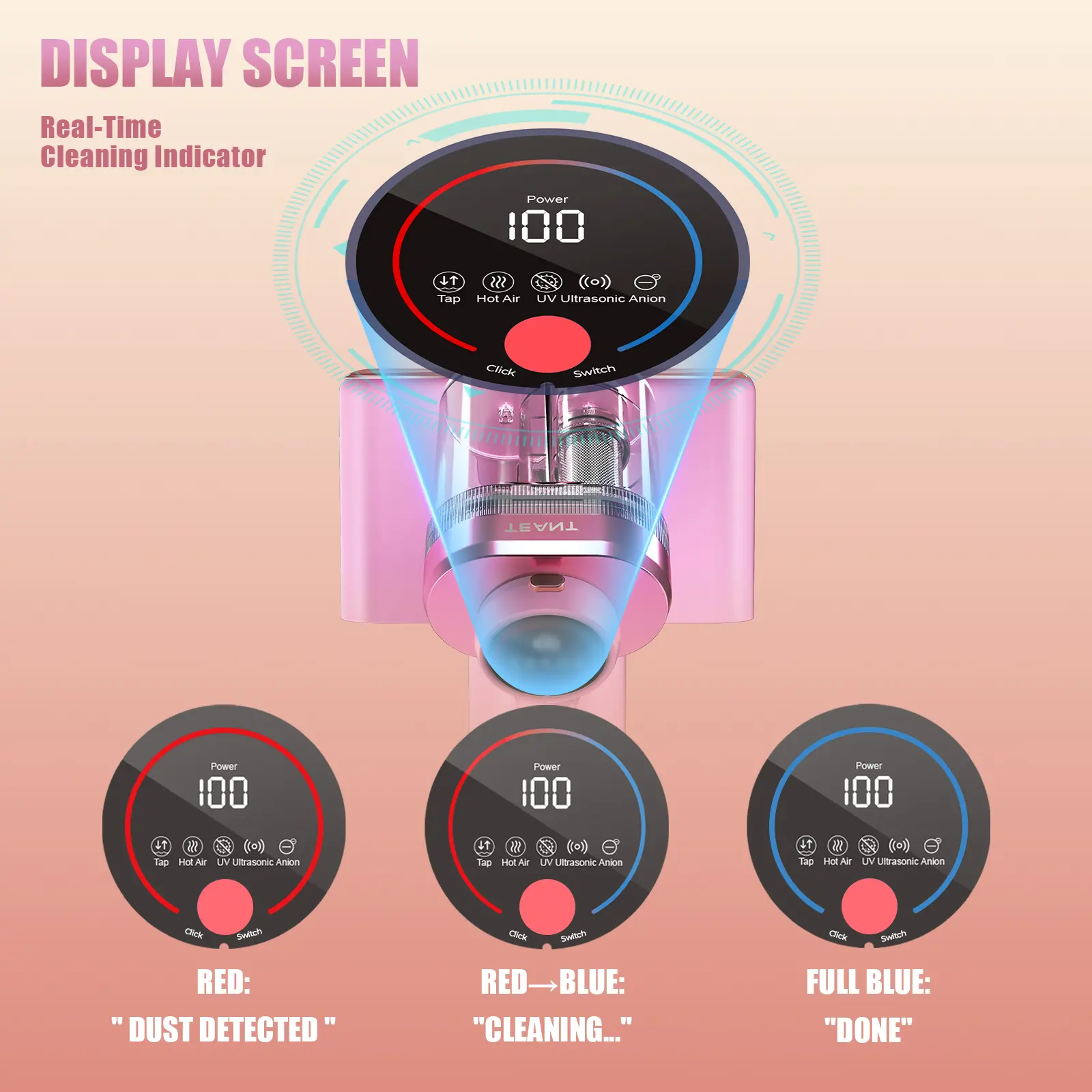Dual Technology of Anion and UV-C Light:Anion can adsorb odor molecules and microparticles in the air, effectively purifying the air and avoiding odor at the air outlet; 253.7nm UV-C light can effectively clean your mattress, sofa, carpet and other fabrics in your home.The dual technology of anion and UV-C Light can deeply clean and prevent secondary pollution.