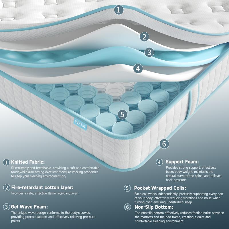 Stay cool and refreshed with our 10-inch and 12-inch mattresses, available in Twin, Full, and Queen sizes. The soft, breathable knitted cover feels gentle on your skin, while wave-shaped memory foam and individually pocketed springs work together to boost airflow and prevent overheating. Wake up energized and ready to take on the day.