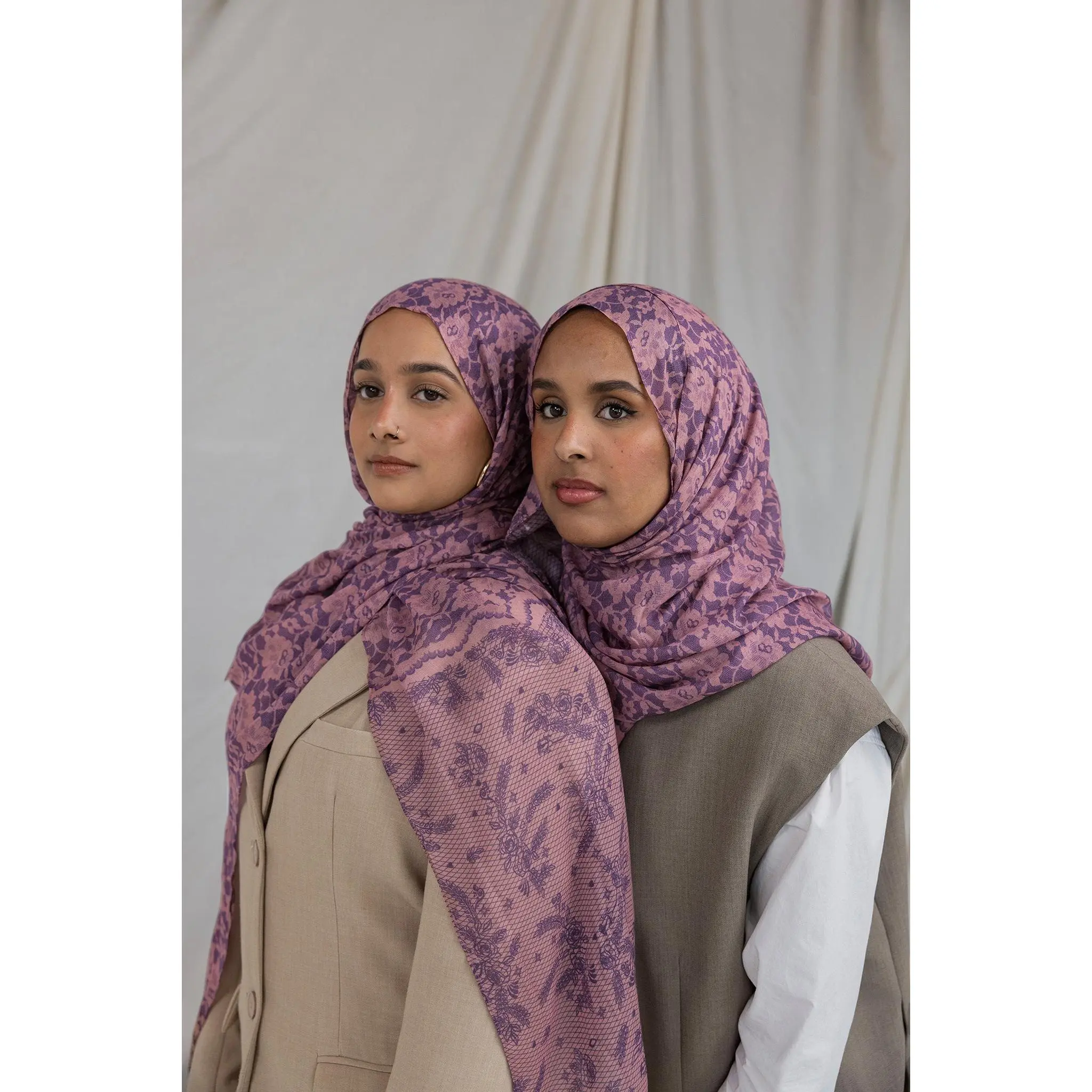 Mauve Lace combines the soft elegance of mauve with a hint of vintage charm, creating a timeless shade that adds depth and sophistication to any outfit. The rich, muted pinkish purple tone is reminiscent of delicate lace, offering a soft, feminine flair that can be effortlessly styled for any occasion. Woven on our signature, lightweight modal fabric, this hijab layers effortlessly for a bold yet timeless look. A true vintage mauve headscarf, this lace edge scarf is also an ethically made hijab crafted with care and conscience.