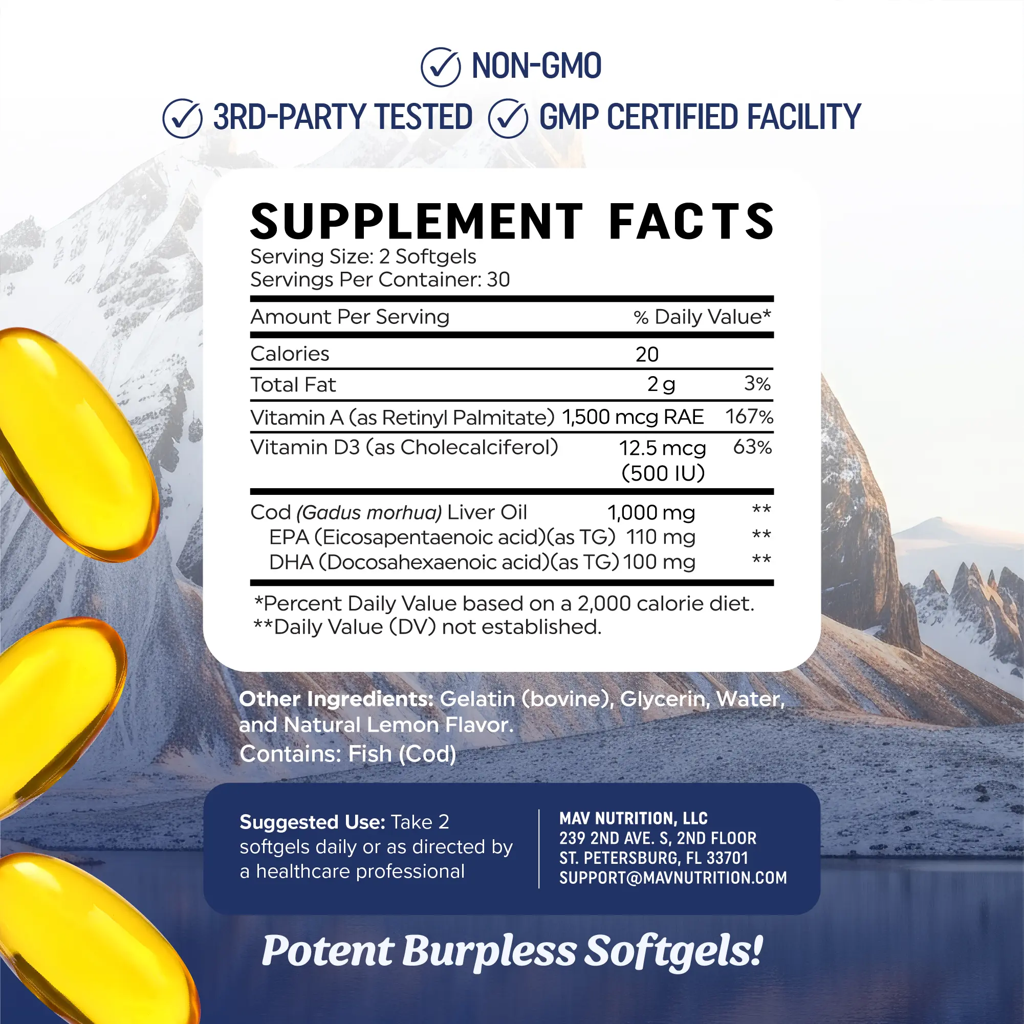 We refine our Cod fish oil using molecular distillation, optimizing purity and filtering out mercury, heavy metals, and other toxins. Our Fish Oil Omega 3 supplements are also Third-Party Tested, ensuring the highest quality. Each serving also includes Vitamins A and D3.