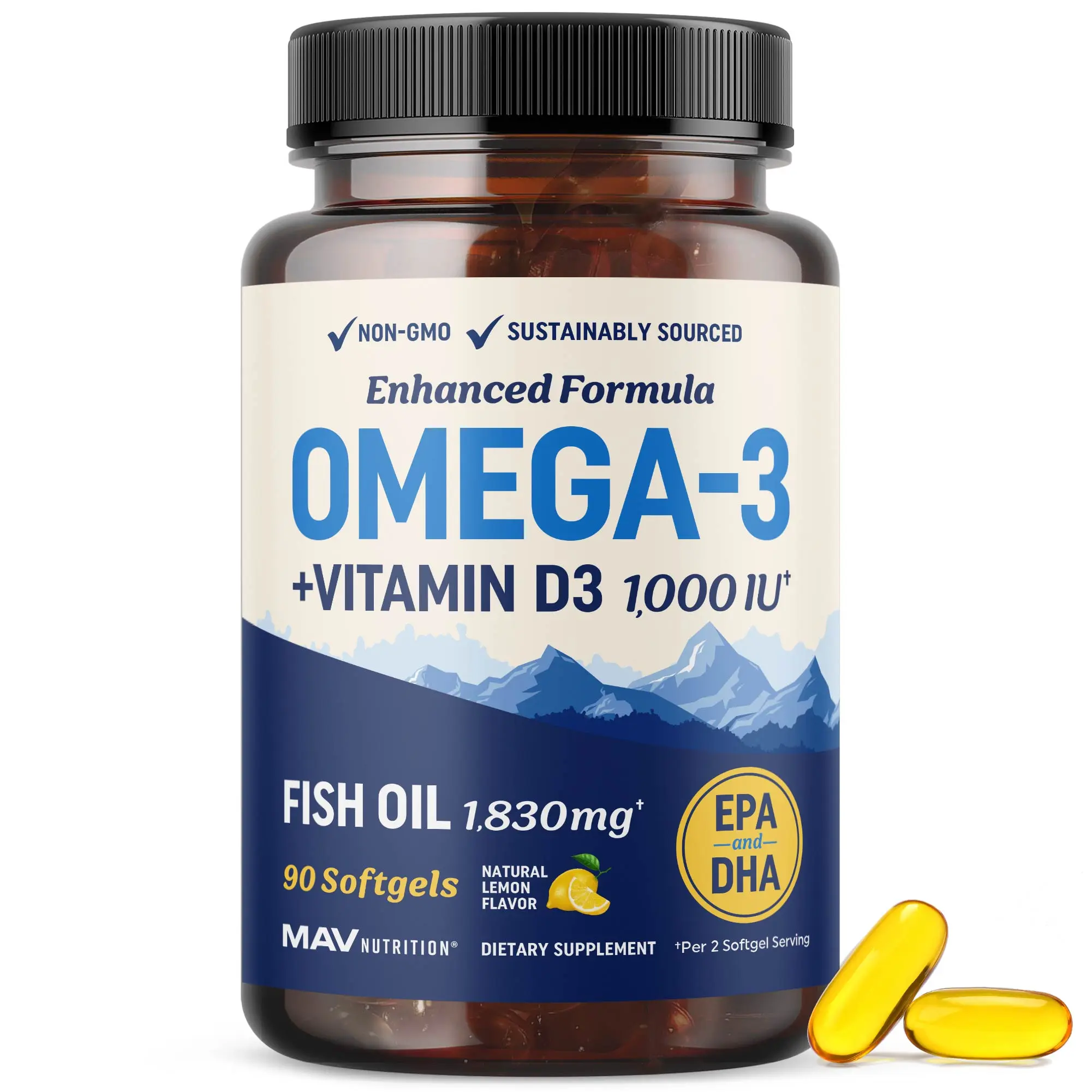 MAV Nutrition’s premium burpless, lemon-flavored Omega 3 Vitamin D is made with sustainably-sourced fish oil. It is Third-Party Tested, Non-GMO, and manufactured to the highest quality standards.