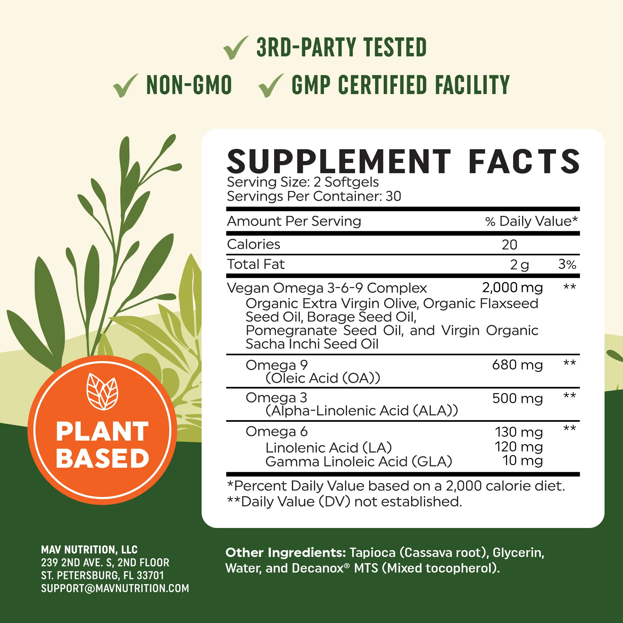 MAV Nutrition’s Omega 3,6,9 is 100% Plant-Based. It is Third-Party Tested, Non-GMO, and manufactured in a GMP certified facility, ensuring the highest quality.