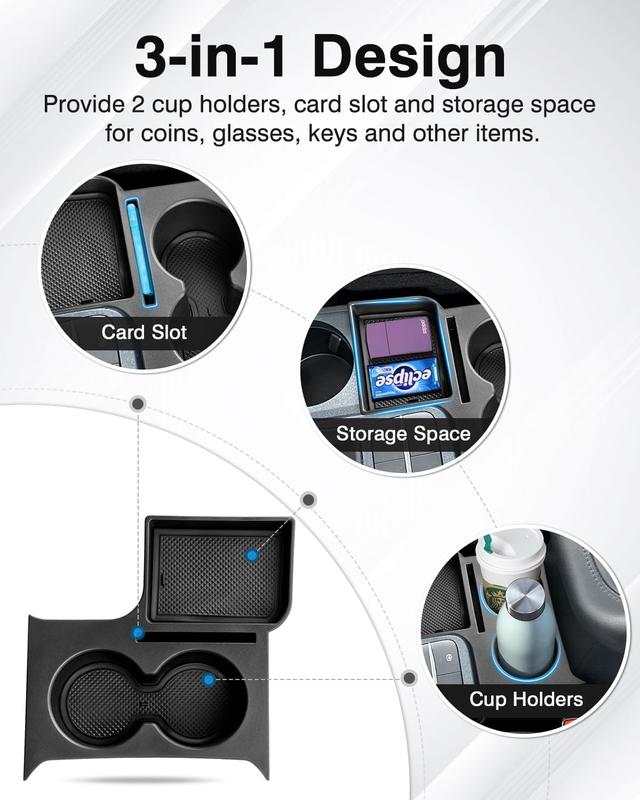 【3-in-1 Design】Unlike other organizer that doesn’t have cup holders, Karltys console tray features dual cup holder accommodating regular sized cans and water bottles. The additional compartment provides a designated space for sunglasses, keys, change and other small items, and card slot for your credit cards.