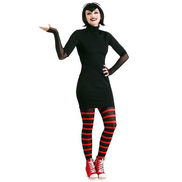 Well, let's just help you get right with your wardrobe so you can enjoy a visit into the human city to show them what eternal fun is really like! This Made by Us look is perfect to help you achieve your every youthful vampire goal. We present the officially licensed Hotel Transylvania Mavis costume! This body-hugging black dress goes to your thighs and is short sleeved, but the mesh fingerless gloves make it look like long sleeves! (The goths will love you.) Finish off the look with your iconic red and black striped tights and the vampiric bob of a wig and you're ready for some real magic!