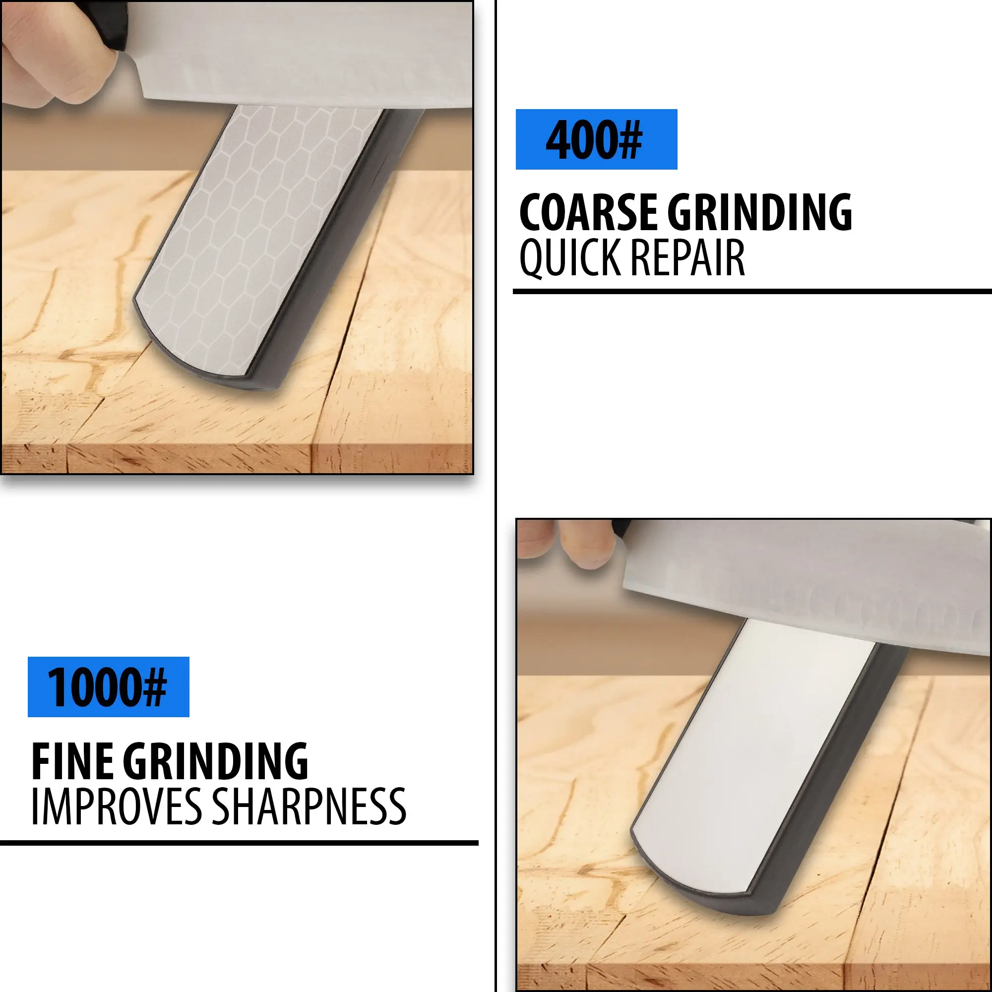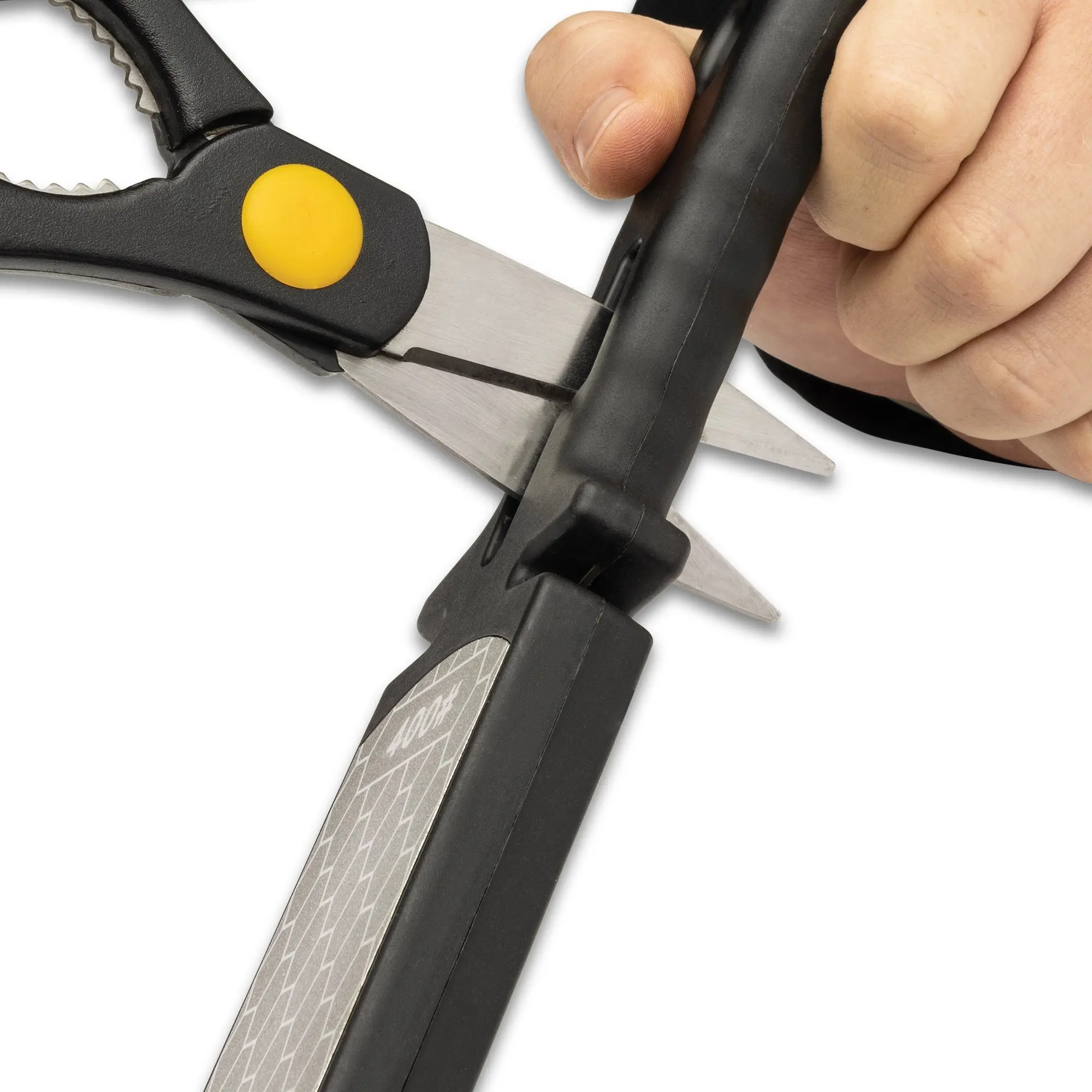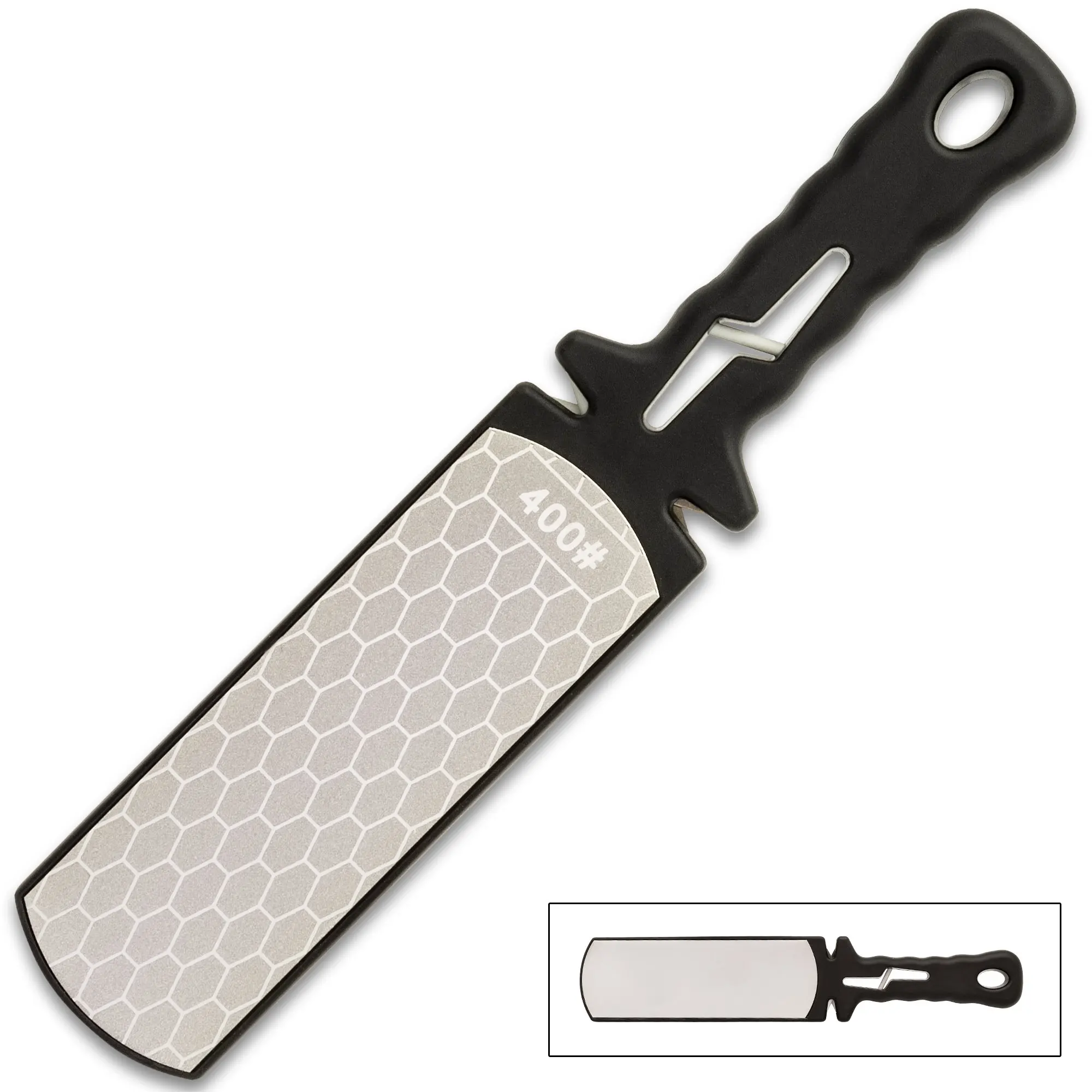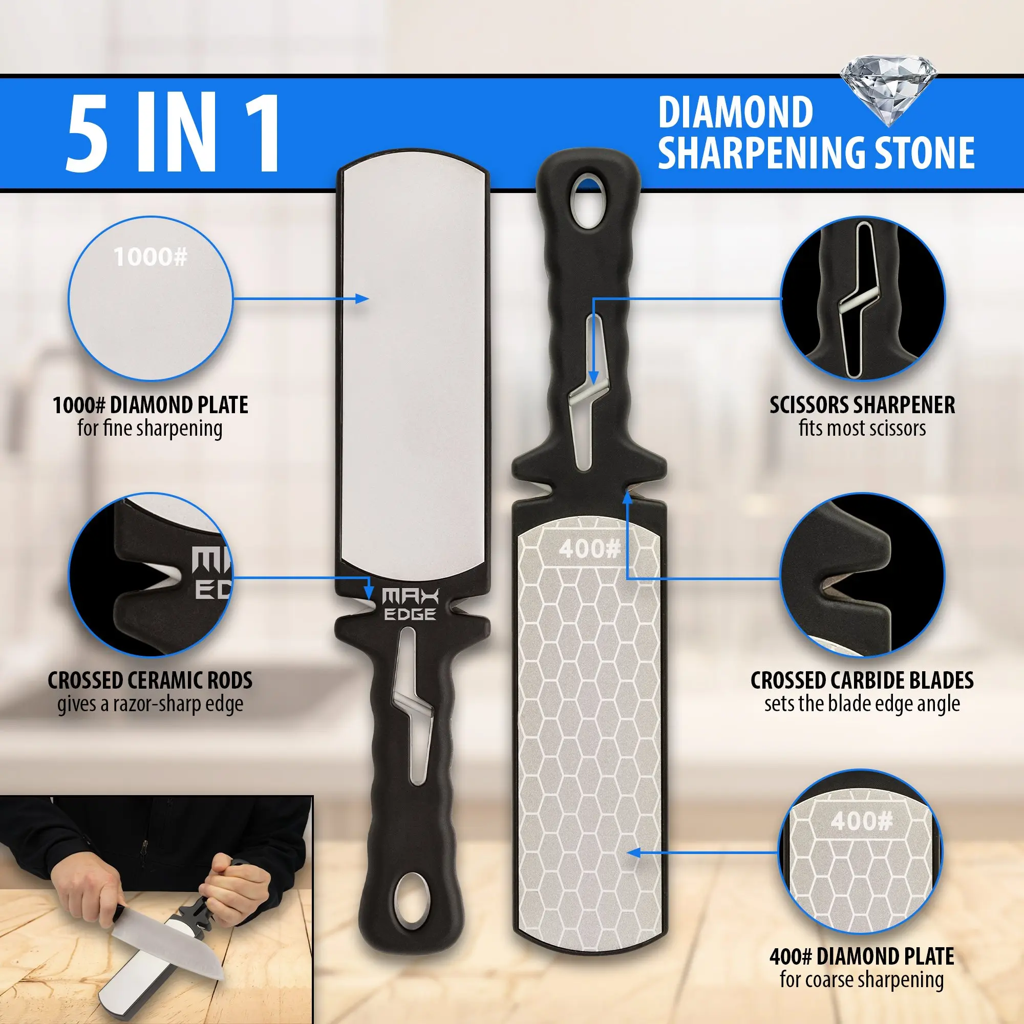 Keep a variety of knives sharp and ready-to-use with the easy-to-use Max Edge 5 In 1 Diamond SharpenerThe double-sided sharpener consists of a 400-grit diamond-coated steel plate and a 1,000-grit diamond-coated steel plateIt has a TPU handle that has finger-grooves for a secure grip and it features a scissors slot, a coarse slot and a fine slot