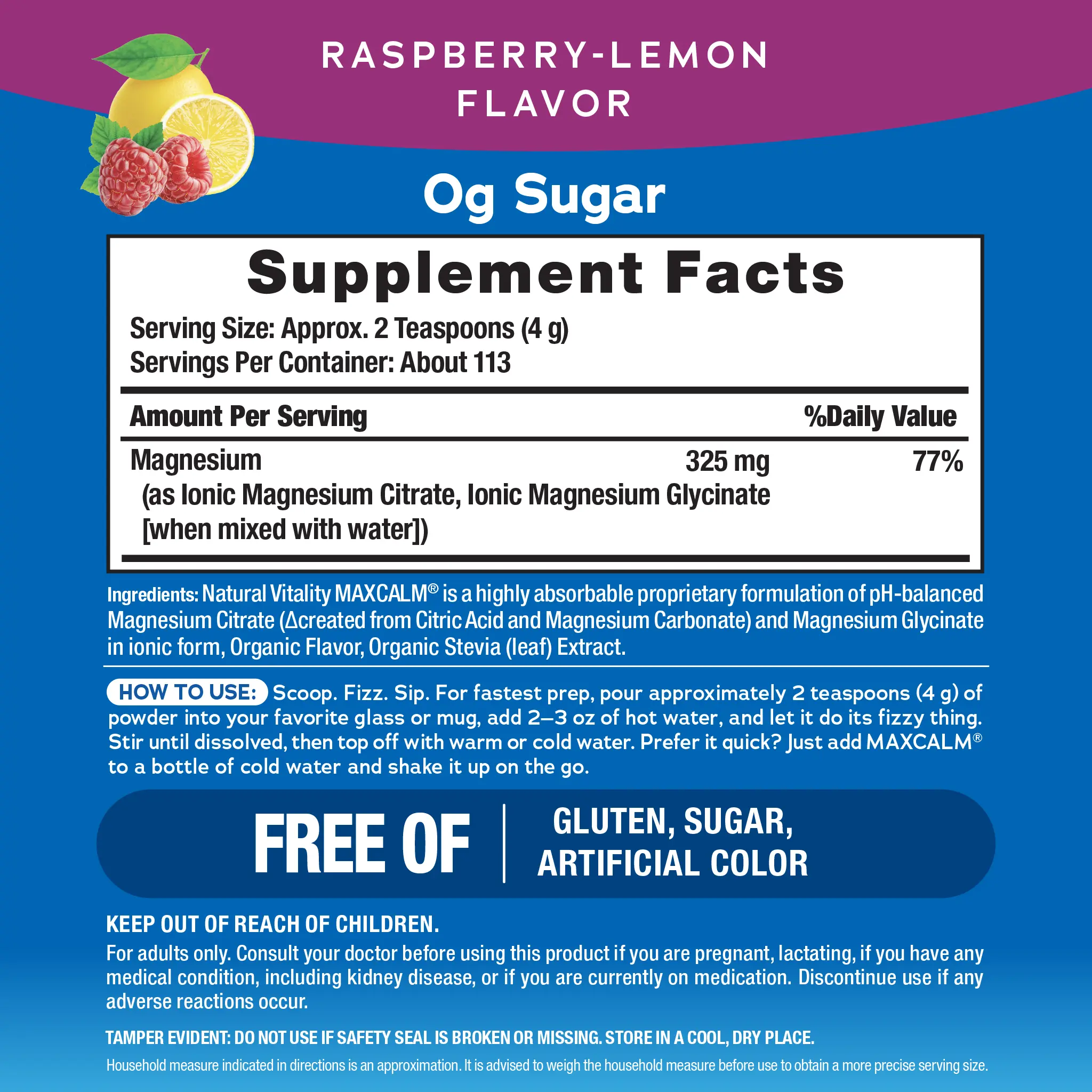 When magnesium carbonate and citric acid mix with water, they transform into Magnesium Citrate, a form more easily absorbed than magnesium oxide.** Sweetened with stevia and featuring a bright raspberry-lemon flavor, MAXCALM is an enjoyable part of your day. Just pour, fizz, mix, and sip.