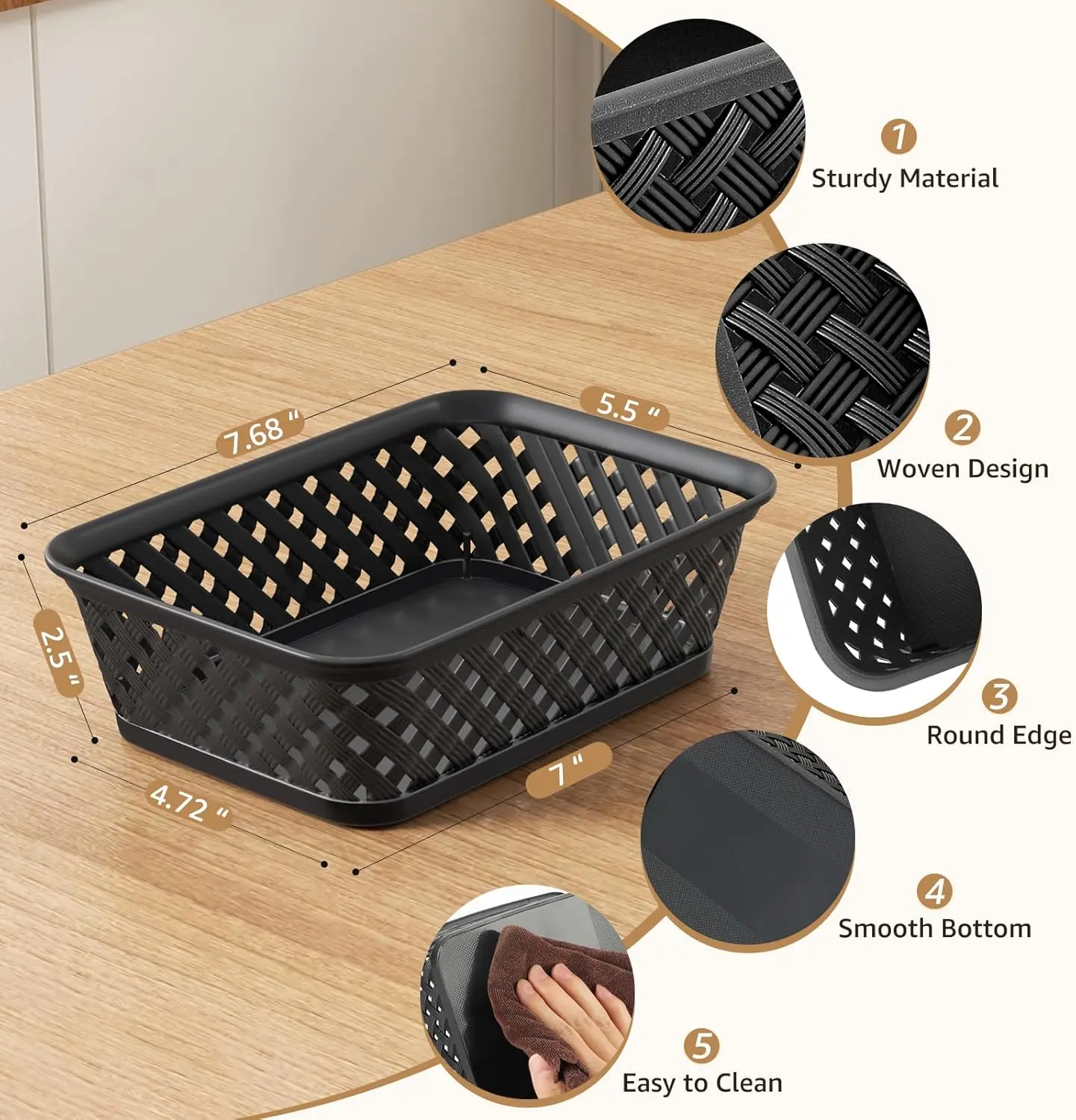 ·Perfect Size: There are two different sizes available, S and M. Perfect size to help you save space and keep your home organized. Different sizes of black baskets give you a variety of options for storing different things. You can choose the most suitable size according to your storage needs. Here is "small" - Mearsures 7.5 x 5.4 x 2.5 inches. Pack of 3.